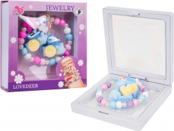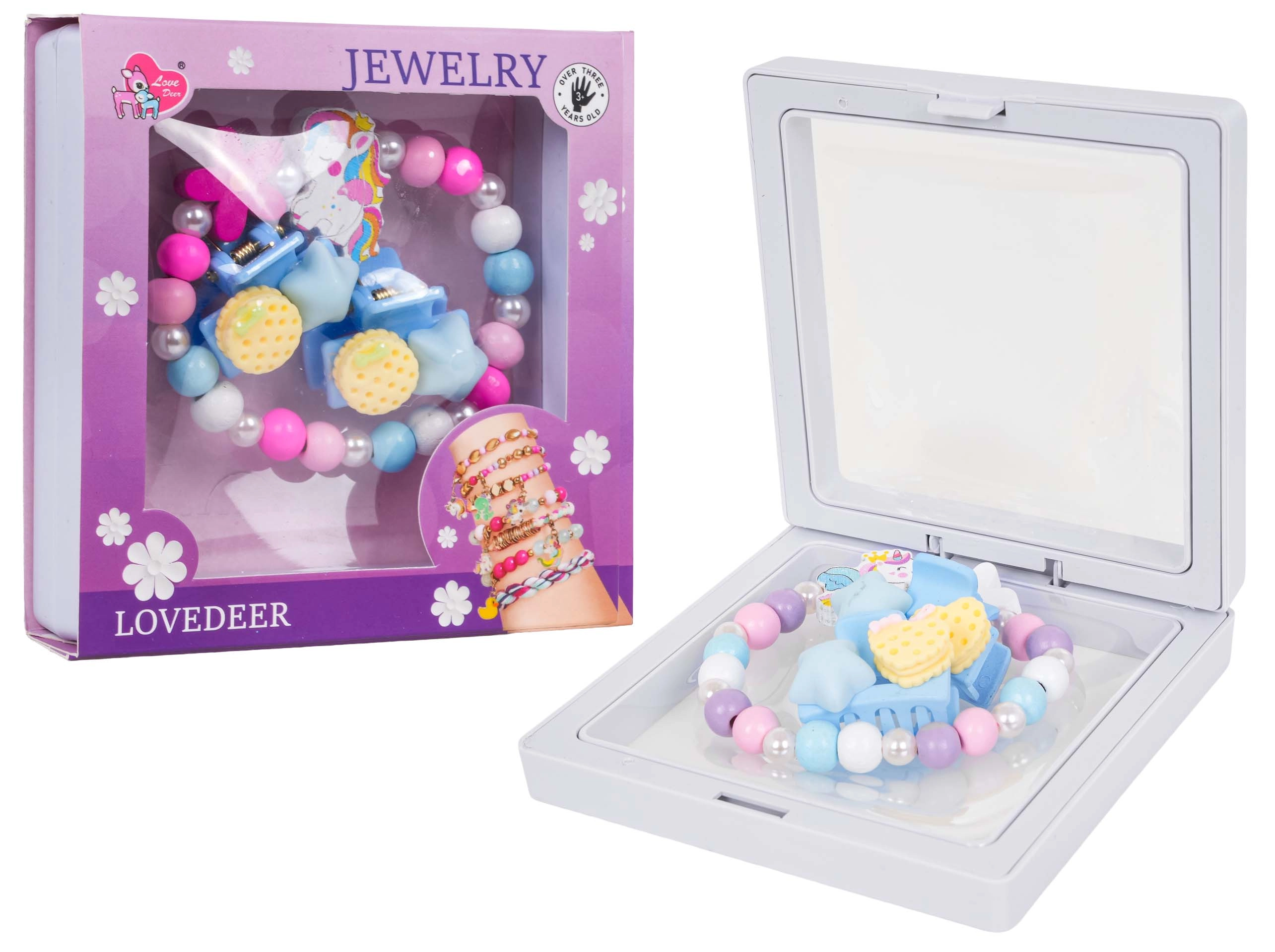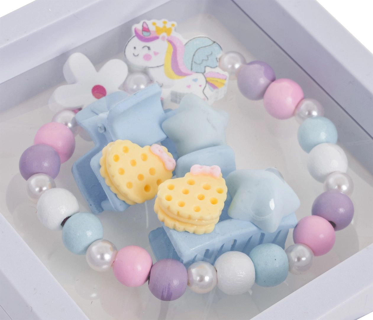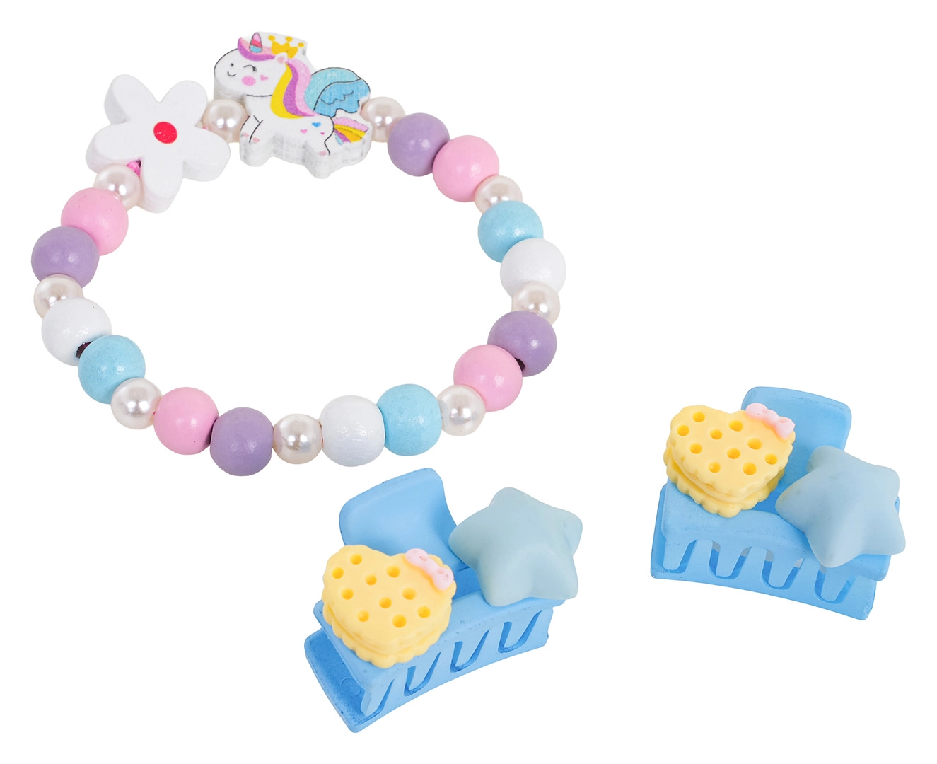 Un adorabile set di gioielli per bambini con motivo unicorno farà felici le piccole vanitose dai 3 anni in su. Include un braccialetto in legno colorato con perline e ciondolo a unicorno e due mollette per capelli. Il set colpisce per i colori vivaci, la lavorazione accurata ed è una ottima idea regalo.
