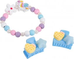 Questo delizioso set per bambini unisce il motivo giocoso dell’unicorno a colori delicati e materiali confortevoli. Il braccialetto è realizzato con perline di legno multicolori e perline decorative, arricchito da un grazioso ciondolo a unicorno. Due pratiche mollette completano ogni acconciatura e stimolano la fantasia durante il gioco.