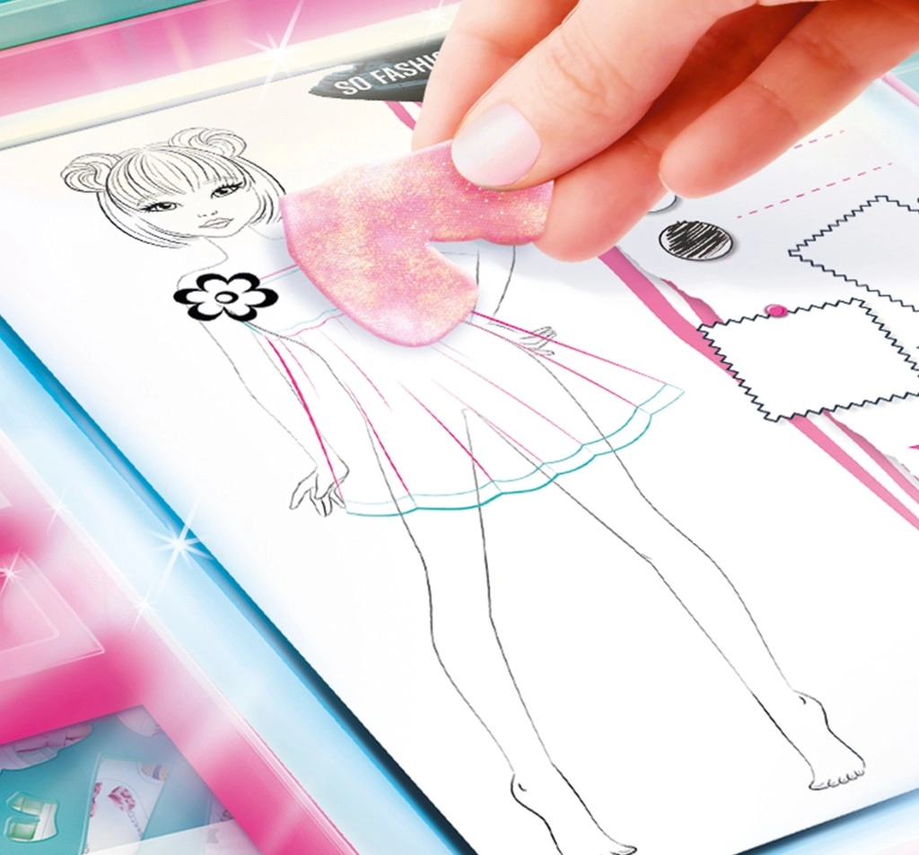 Nella confezione trovi tutto ciò che serve a un piccolo stilista: modelli da ricalcare, sagome, fogli e rotolini stampati, tessuti autoadesivi, matite colorate, un pennarello e strass con adesivi per una decorazione perfetta. Basta inserire 3× AAA e si può iniziare a creare.