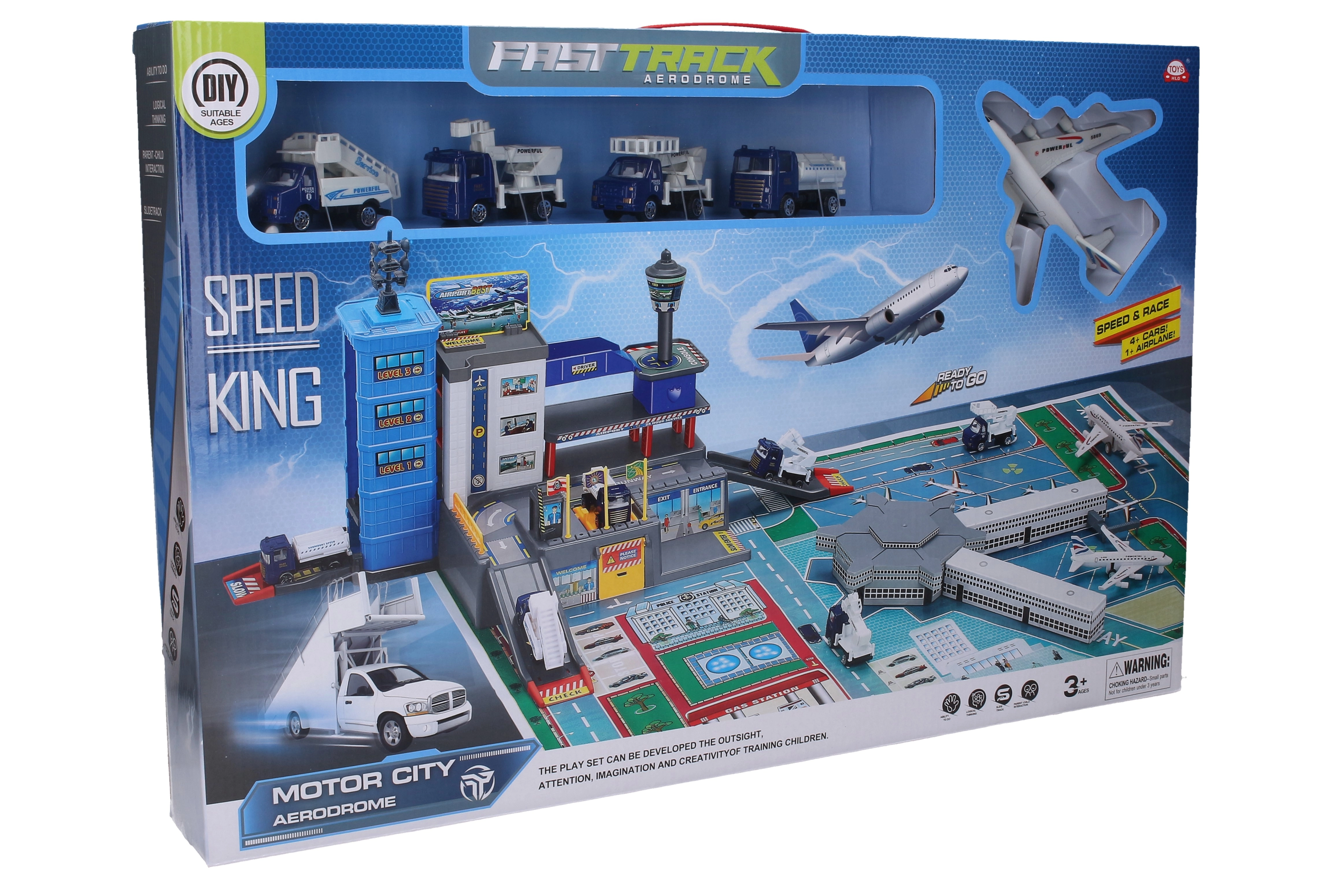 Costruisci a casa il tuo aeroporto brulicante di attività! Questo set offre tutto ciò di cui i bambini hanno bisogno per scenari emozionanti del traffico aereo, dagli atterraggi degli aerei al movimento dei mezzi di servizio sulla pista. Le automobiline e l'aereo in metallo sono realistici e, grazie alle ruote libere, il gioco è fluido e divertente.