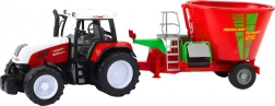 - trattore rosso e bianco, rimorchio rosso con miscelatore