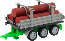 Trattore con rimorchio e tronchi formano un set completo. Facile aggancio grazie al gancio di traino e allo scorrimento fluido delle ruote.