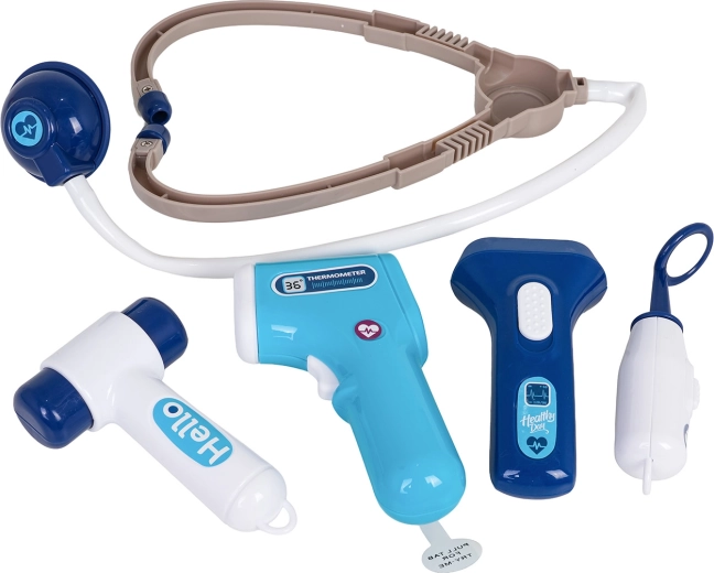 Stetoscopio, termometro senza contatto con luce, siringa, forbici, pinzetta, specchietto, martelletto, occhiali, scheda paziente e altri accessori per un gioco creativo.