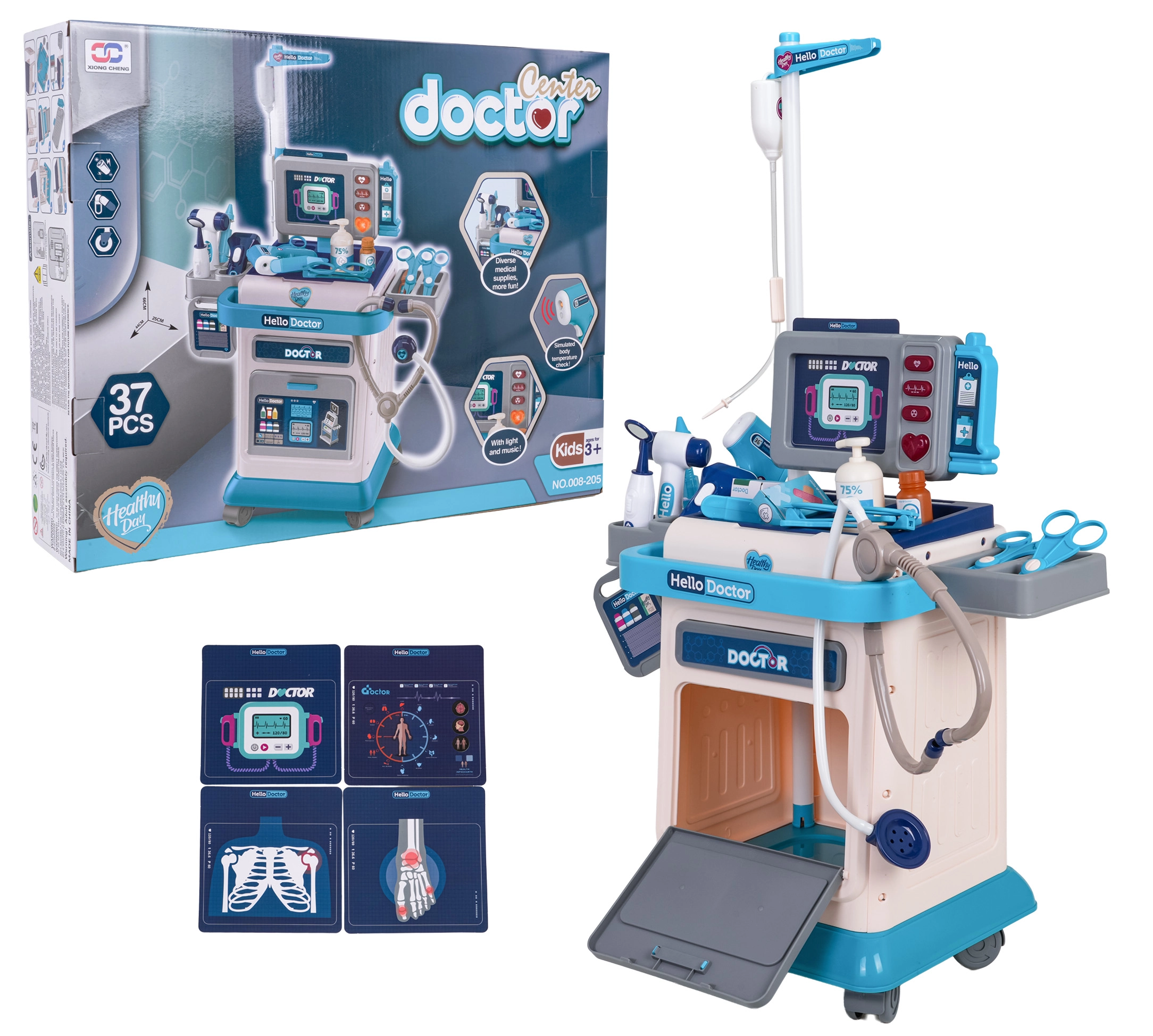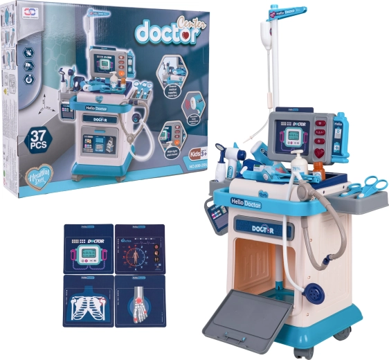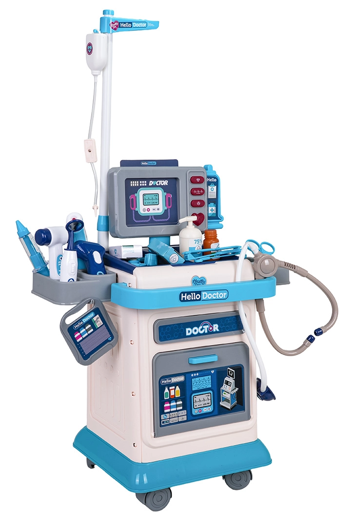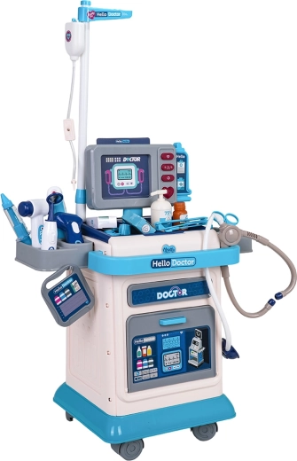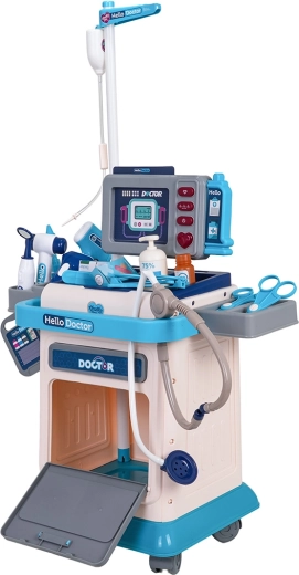 Carrello medico interattivo per bambini dai 3 anni con ricca dotazione, effetti luminosi e sonori. Include monitor con immagini intercambiabili, pulsanti funzionali e carrello mobile con ruote per un gioco del dottore realistico. Stetoscopio, termometro, siringa e altri strumenti aiutano a sviluppare fantasia, empatia e motricità fine.