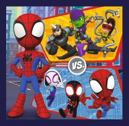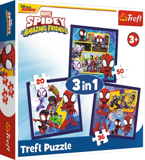 Set di puzzle per bambini 3 in 1 con soggetti di Spidey, ragni e dinosauri, che offre tre immagini da 20, 36 e 50 pezzi. Ottimo per sviluppare logica, pazienza e motricità fine. Ogni puzzle completato misura circa 20 × 19,5 cm.
