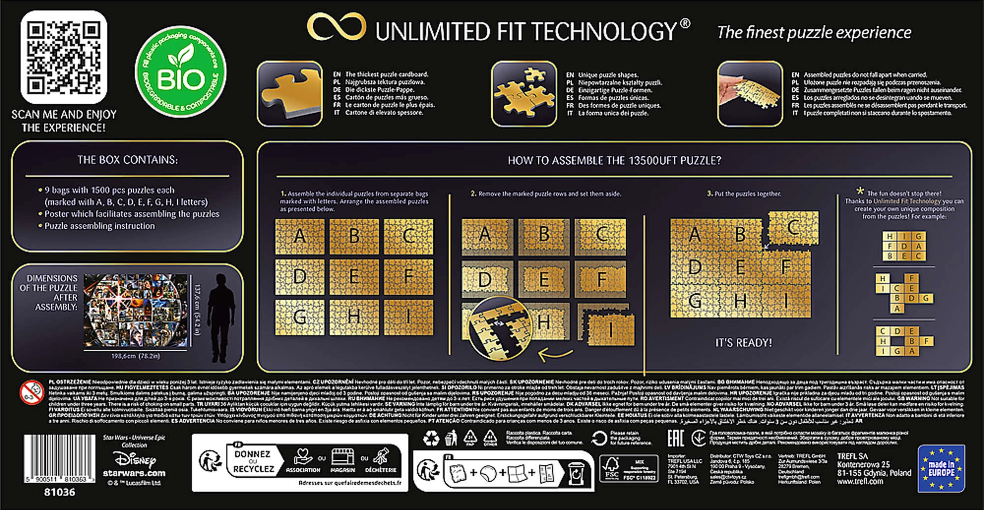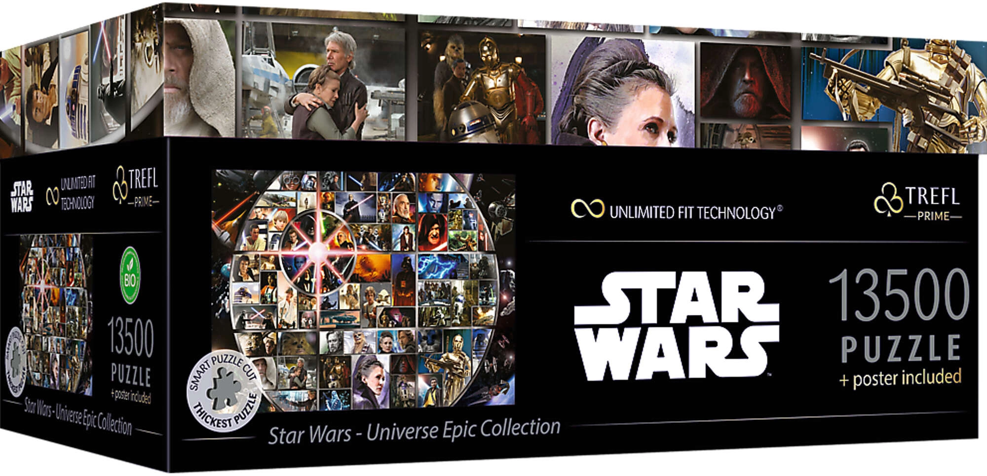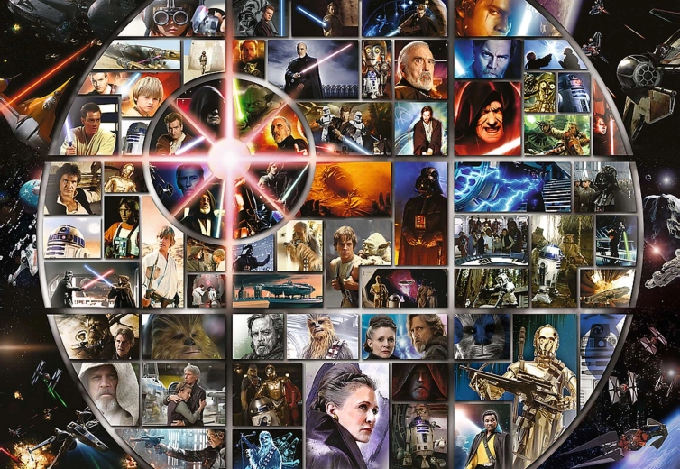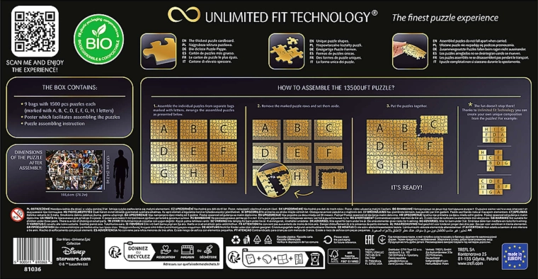 Scopri il gigantesco set di puzzle dalla saga cinematografica STAR WARS del marchio TREFL con tecnologia UFT (Unlimited Fit Technology). Il set include 9 puzzle separati da 1500 pezzi ciascuno, che possono essere assemblati come un'unica enorme immagine collage oppure come motivi indipendenti. La confezione compostabile e biodegradabile rispetta l'ambiente.