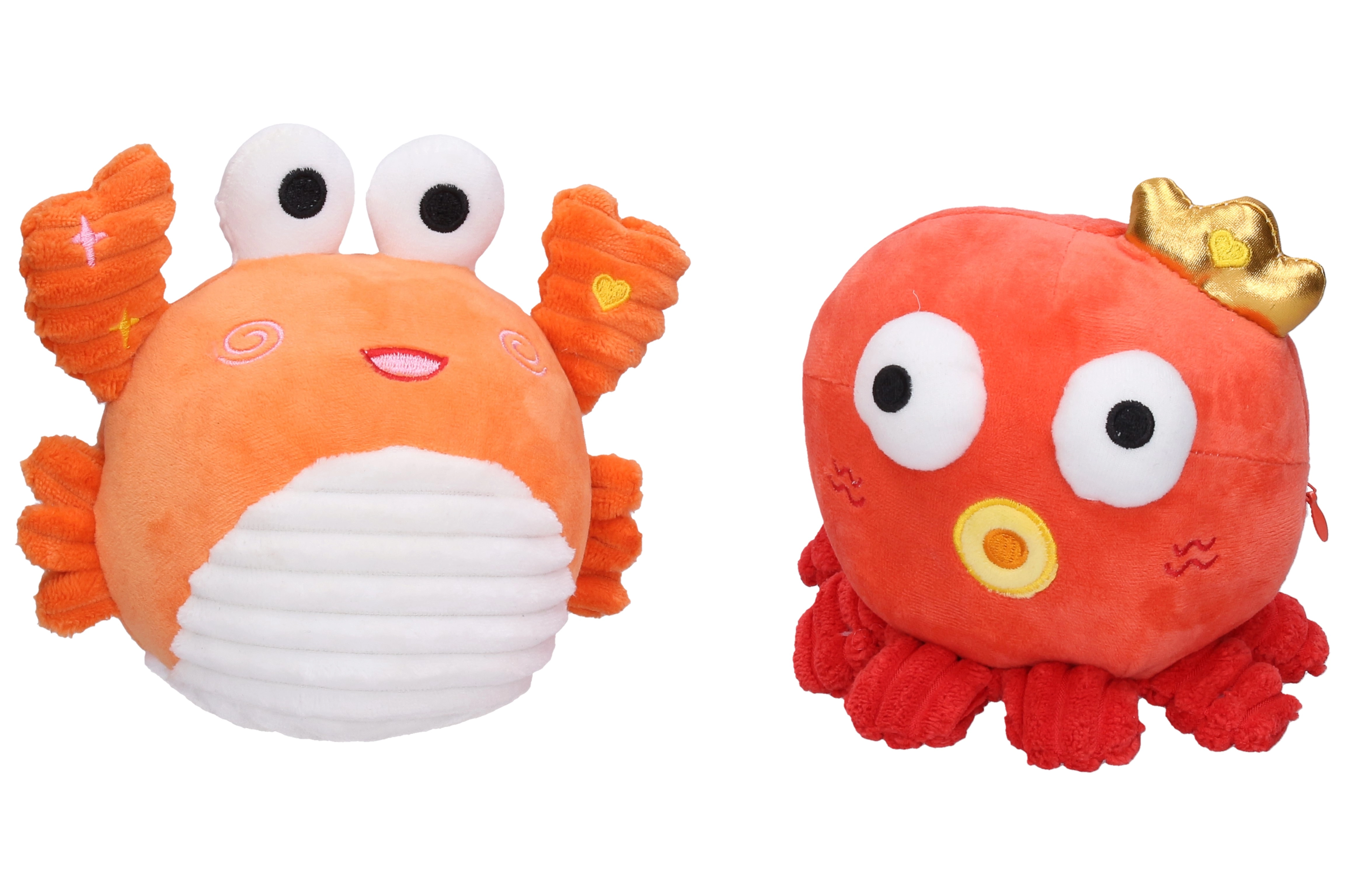 Puoi scegliere tra 4 adorabili varianti – granchio, pulcino, polpo blu e polpo rosso. Ogni animaletto ha il proprio elemento di controllo (chela, ala, cappellino/coroncina), così i bambini capiscono subito come usarlo. Lo spegnimento è gestito da un pratico interruttore on/off all’interno del giocattolo e la cerniera posteriore consente un facile accesso alle batterie.