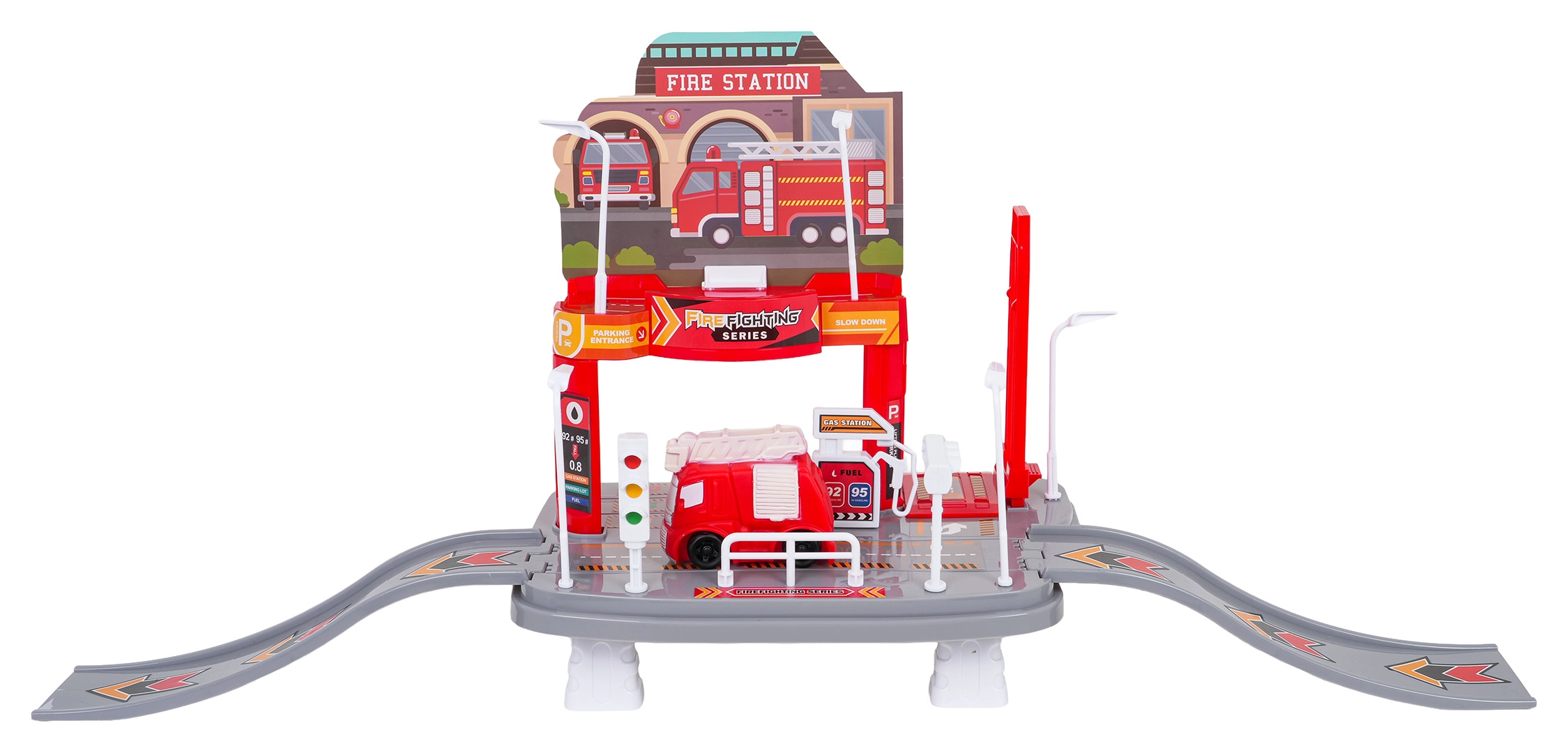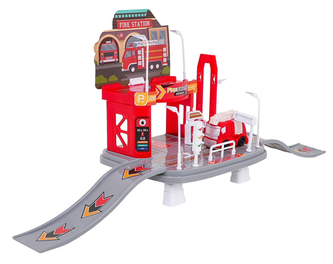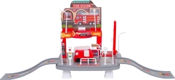 Stazione di rifornimento, segnali stradali, lampioni e ingresso/uscita creano l’ambiente credibile di una caserma dei pompieri e stimolano la fantasia dei bambini.