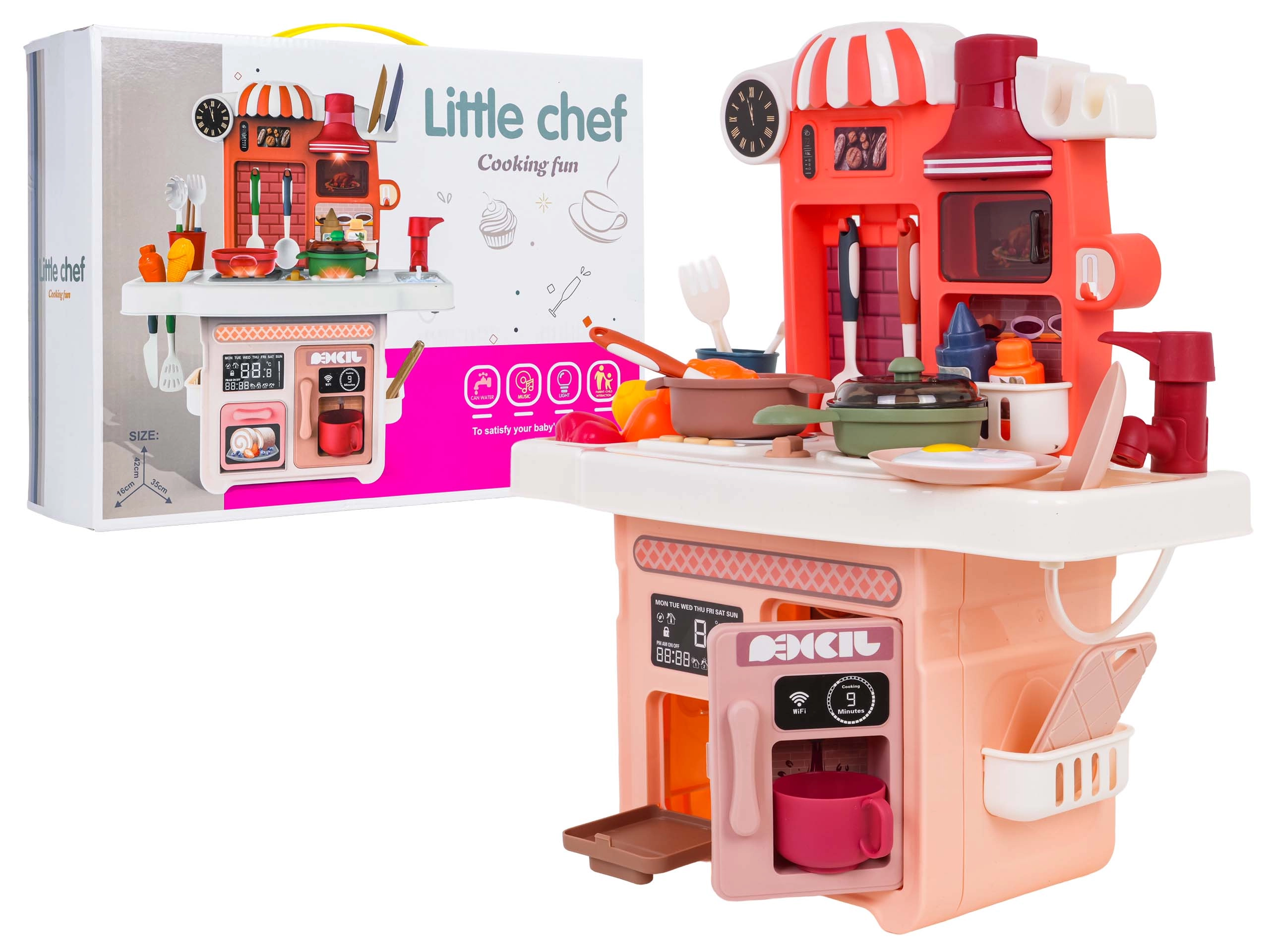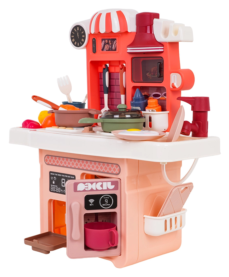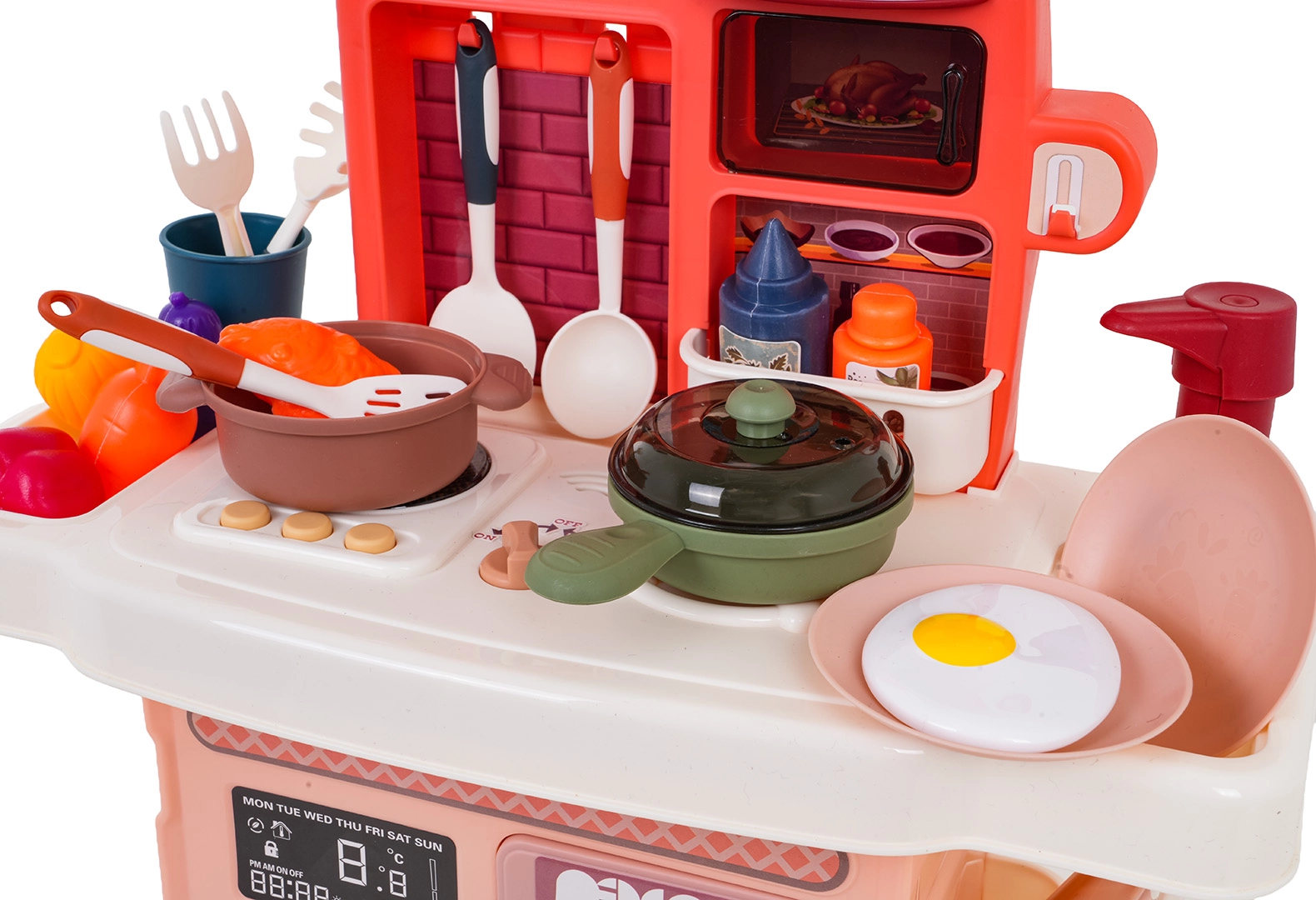 L’attrazione principale è il rubinetto funzionante: dall’unità a batterie l’acqua scorre nel lavello, così i bambini possono “lavare i piatti” come in una vera cucina. Sono presenti anche forno apribile, imitazione di macchina del caffè e cappa aspirante illuminata. I ricchi accessori (pentole, padella, utensili, piattini e alimenti) ampliano le possibilità di gioco.