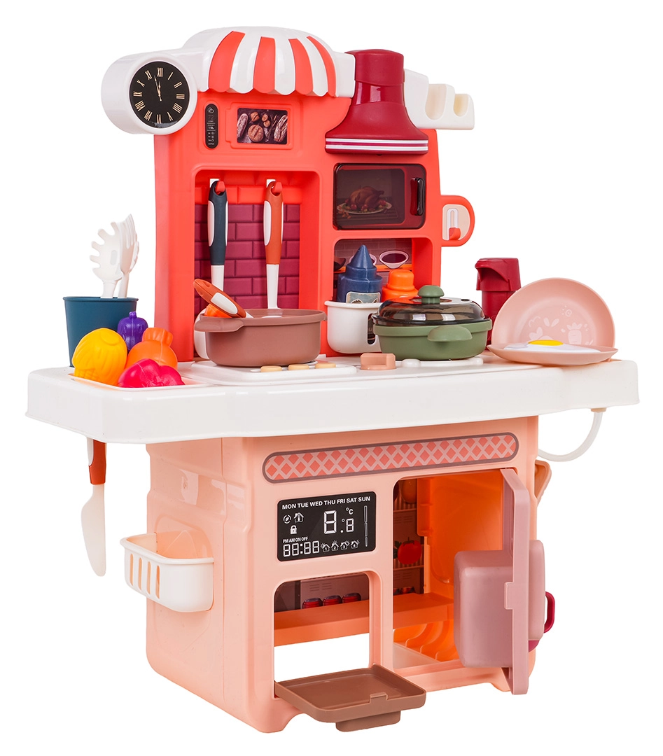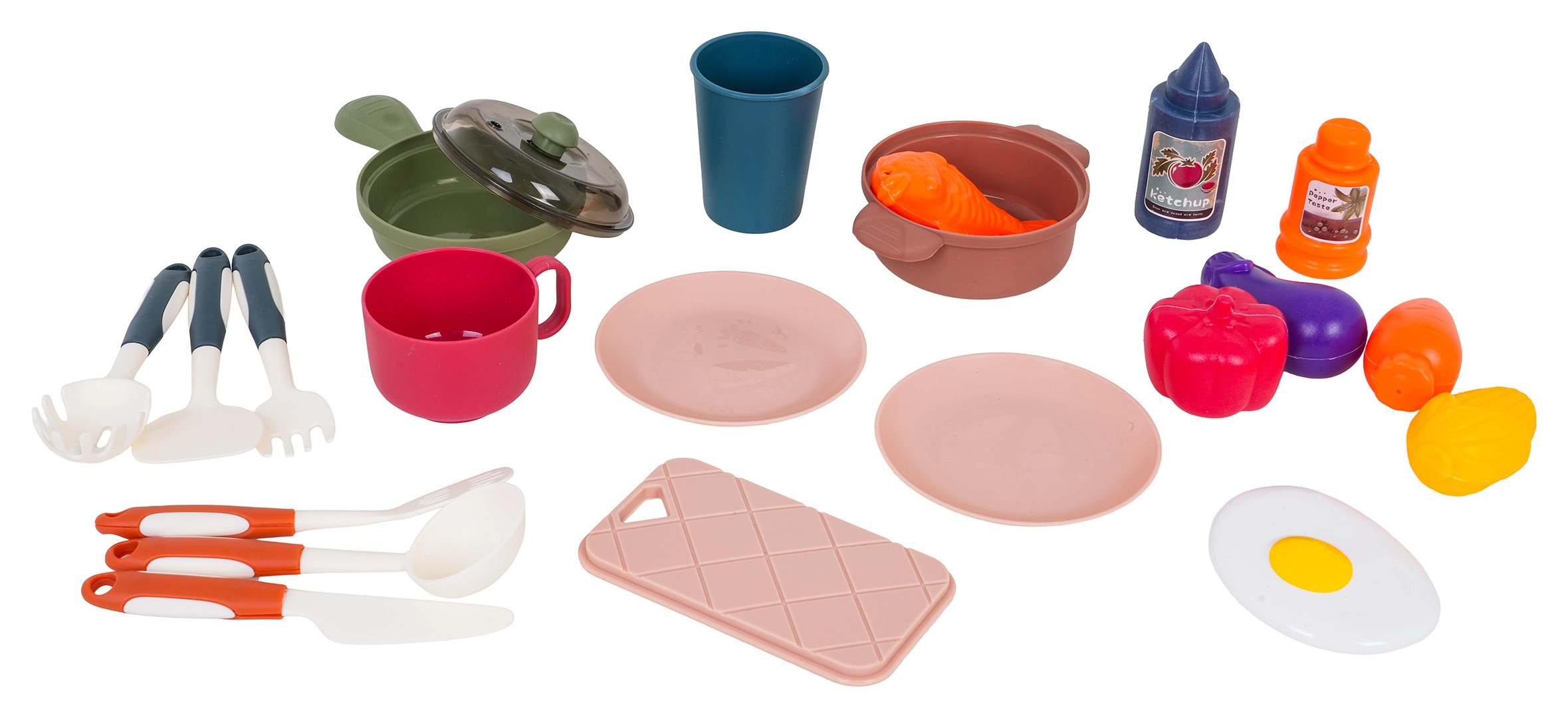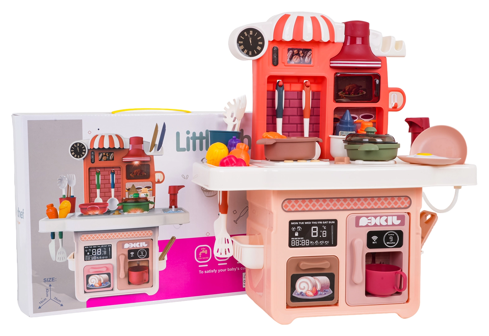 L’attrazione principale è il rubinetto funzionante: dall’unità a batterie l’acqua scorre nel lavello, così i bambini possono “lavare i piatti” come in una vera cucina. Sono presenti anche forno apribile, imitazione di macchina del caffè e cappa aspirante illuminata. I ricchi accessori (pentole, padella, utensili, piattini e alimenti) ampliano le possibilità di gioco.
