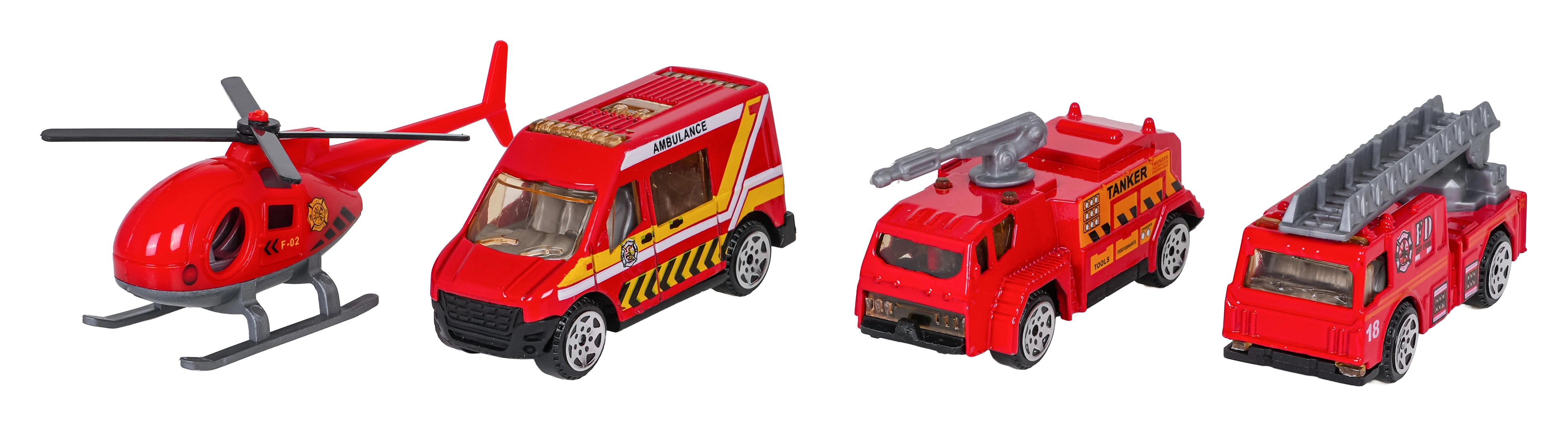 Tre robuste macchinine in metallo con parti mobili e un elicottero dettagliato ampliano le possibilità di gioco e il realismo dell’azione.