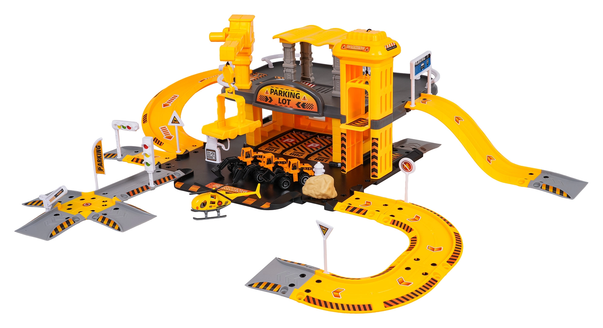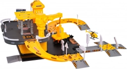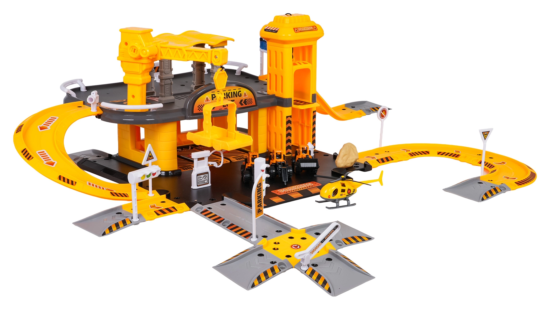 Questo parcheggio da costruzione, curato nei dettagli, conquisterà tutti i piccoli fan dei mezzi da cantiere. Il piano inferiore offre una stazione di servizio e strade; l’ascensore manuale porta i veicoli al primo piano, dove si trova la zona cantiere con gru funzionante. Il set è compatto ma offre tante possibilità di gioco e una guida fluida sulle rampe elicoidali.