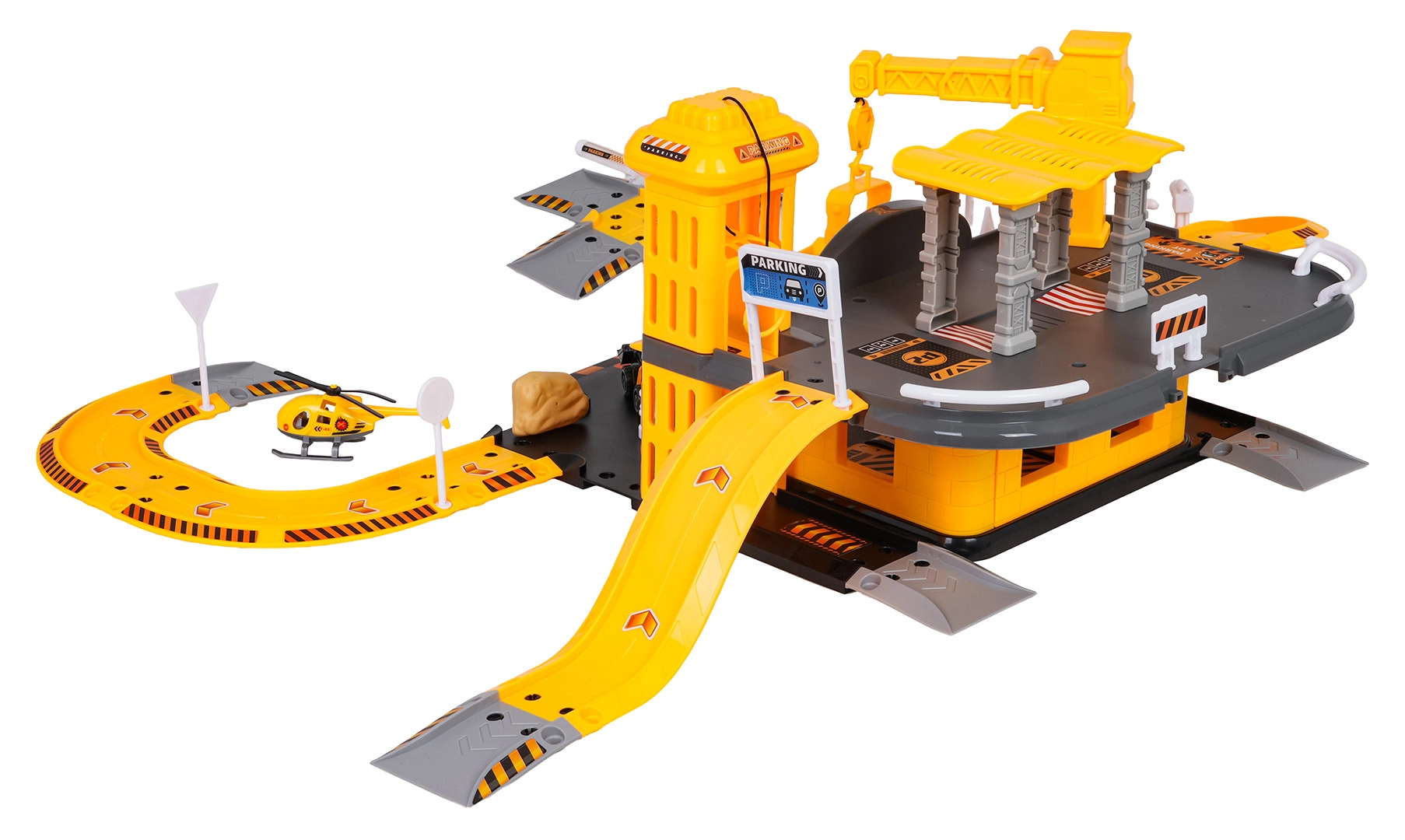 Piano inferiore con strada e stazione di servizio, piano superiore con area cantiere e gru funzionante. Gioco realistico in cantiere ogni giorno.
