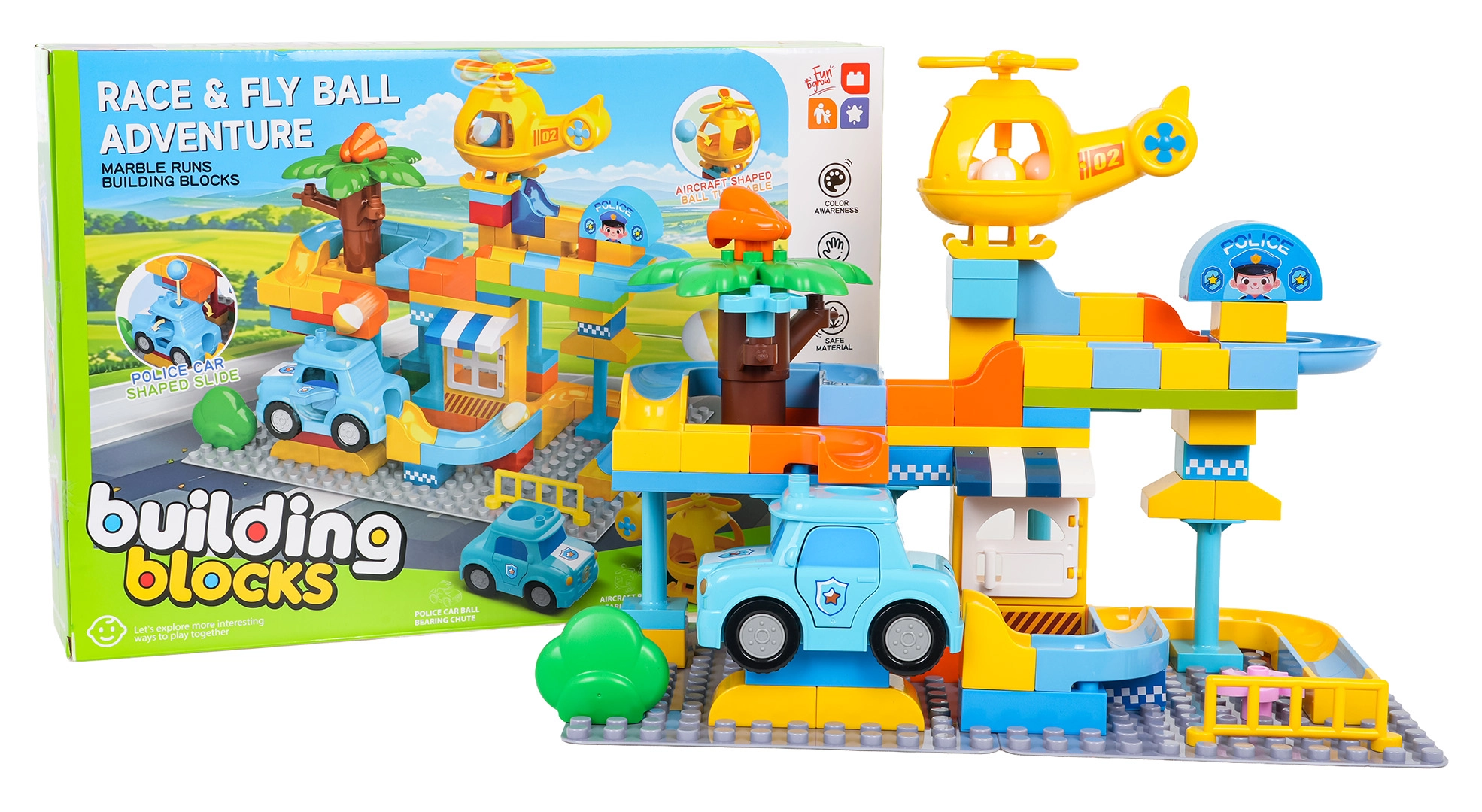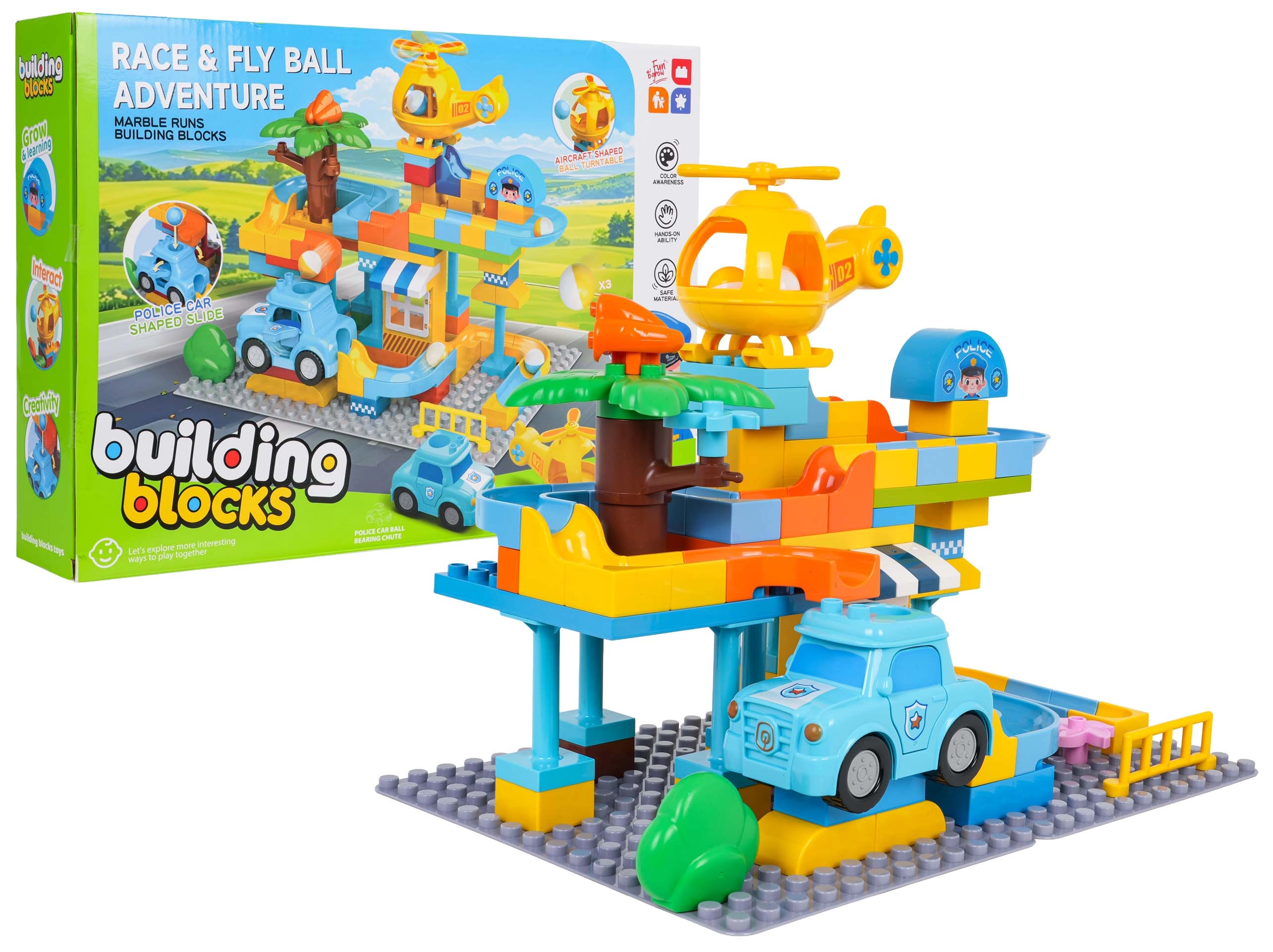 Nella confezione troverai una macchinina della polizia, un elicottero e 3 palline. Il dettaglio studiato – aperture nella macchinina e nell’elicottero – permette alle palline di attraversare e aggiunge una nuova dimensione al gioco. Il set è realizzato con materiali di qualità e sicuri ed è adatto a bambini dai 3 anni.