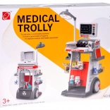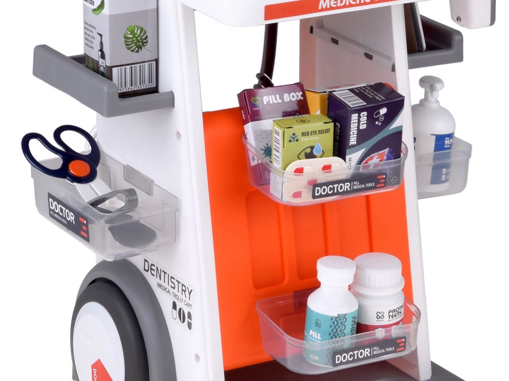 Struttura robusta su ruote, più ripiani e vaschette per riporre in modo ordinato strumenti e “medicine”. I bambini possono portare facilmente il carrello ovunque e avere tutto a disposizione.