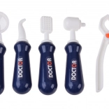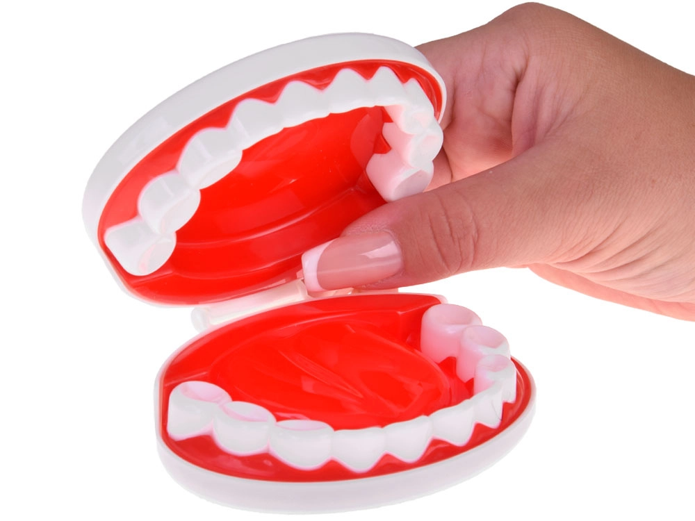 Il modello di mascella apribile e il “dente” separato insegnano corrette abitudini di igiene orale. Specchietto, spazzolino e strumenti dentistici favoriscono un apprendimento ludico.
