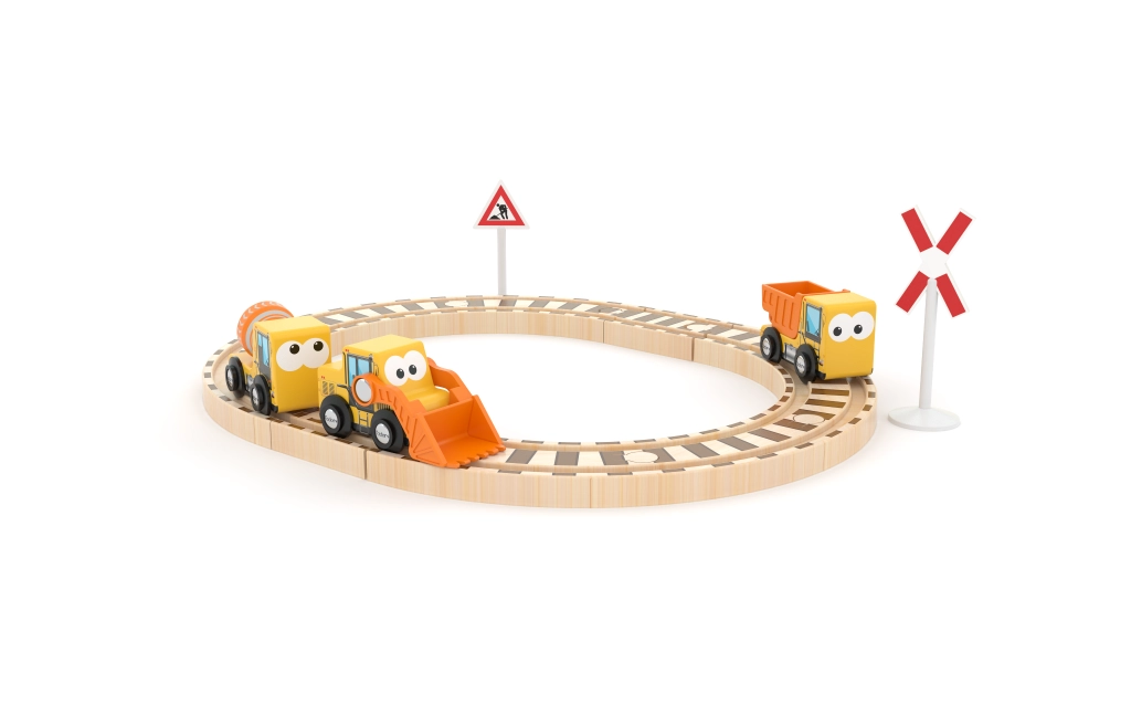 Scoprite un divertente set di gioco in legno con circuito ferroviario e macchine edili, che favorisce fantasia, motricità fine e gioco creativo. Realizzato in legno ecologico e sostenibile senza sostanze chimiche. Ideale per bambini a partire da 18 mesi.