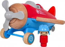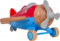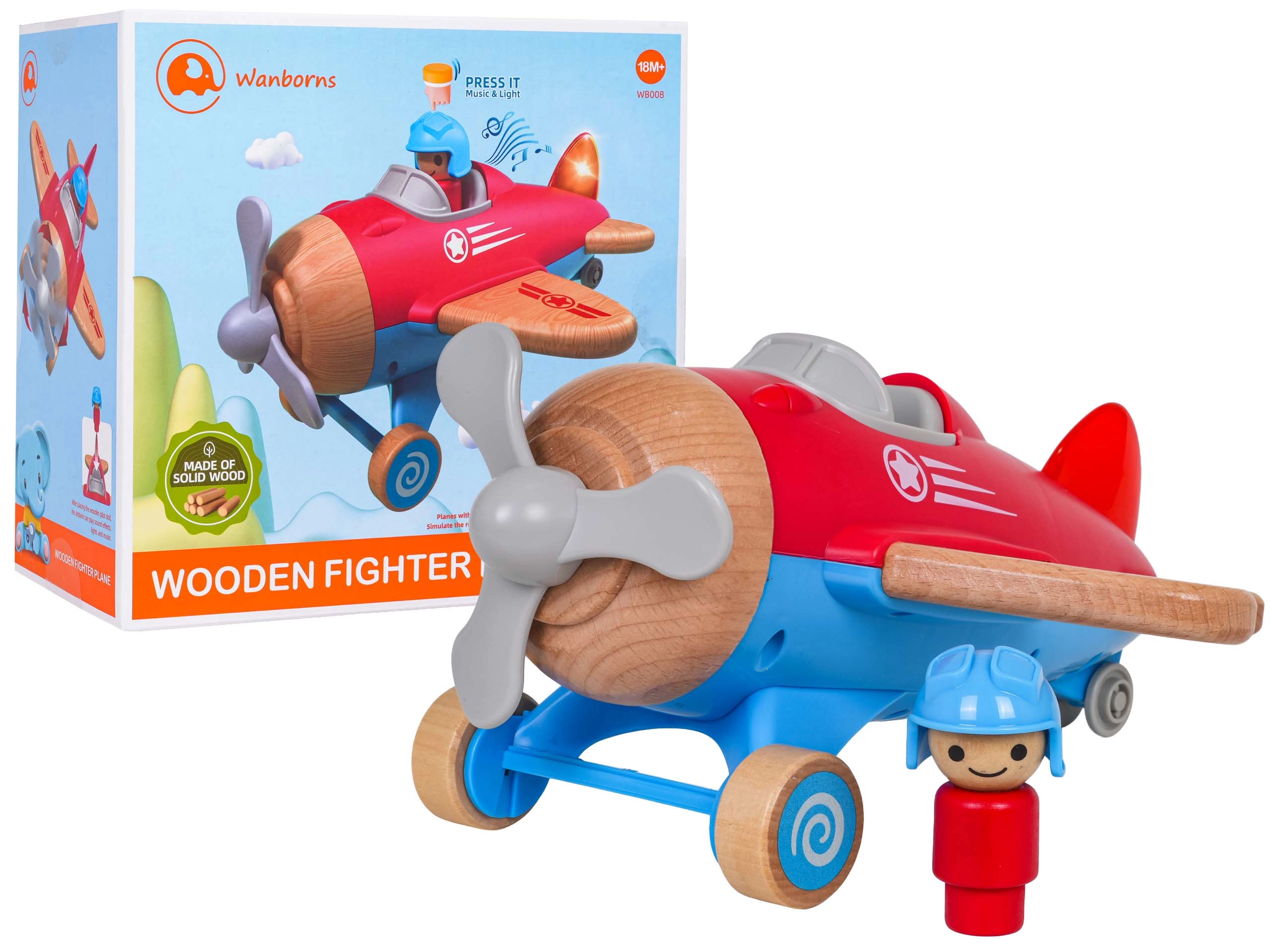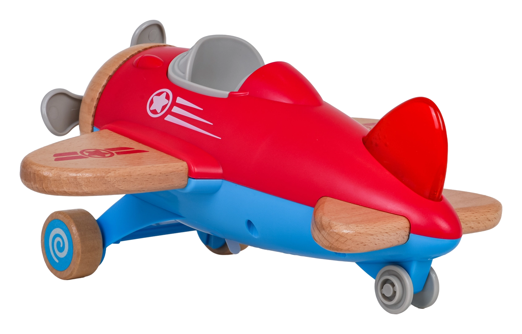 Colorato aereo in legno per i più piccoli dai 18 mesi, offre effetti luminosi e sonori, elica rotante e ruote mobili. La combinazione di legno e plastica di qualità garantisce resistenza e un gioco sicuro senza spigoli vivi. Premendo la figurina del pilota si attivano melodie e suoni di decollo e si illumina l'ala posteriore.
