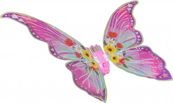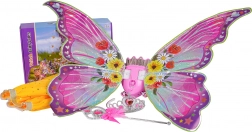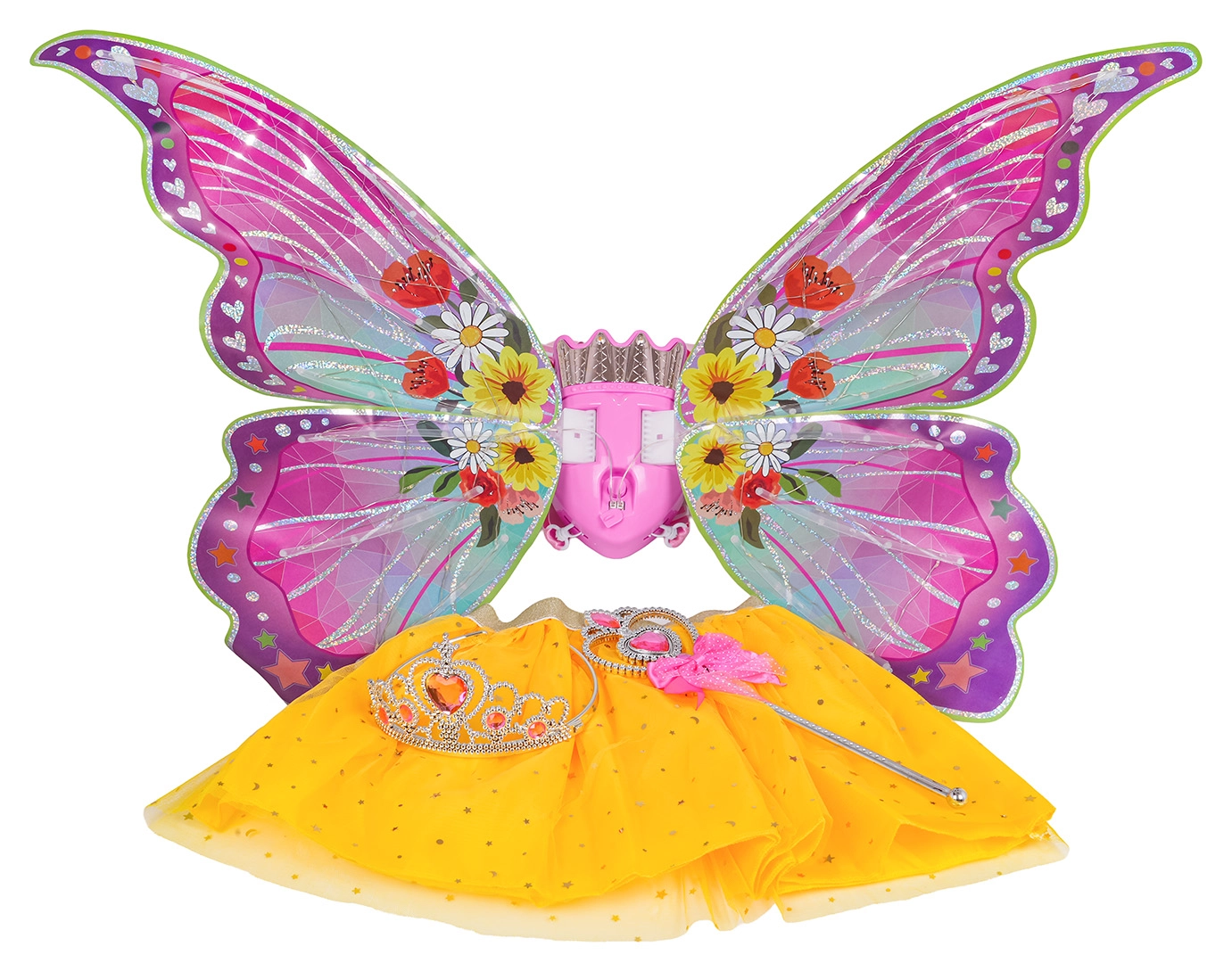 - ali di farfalla con luce e suono, gonna gialla, bacchetta magica, corona