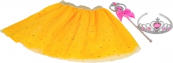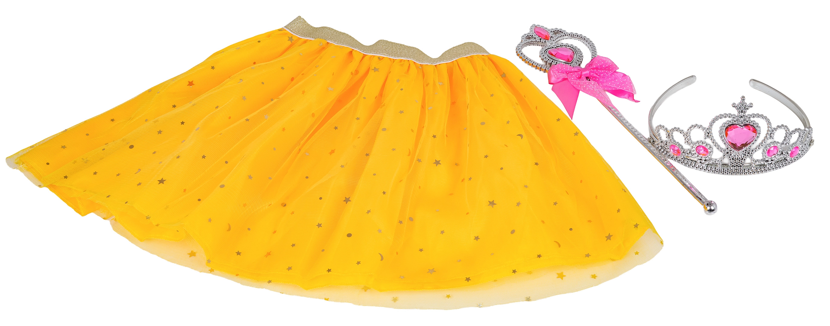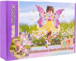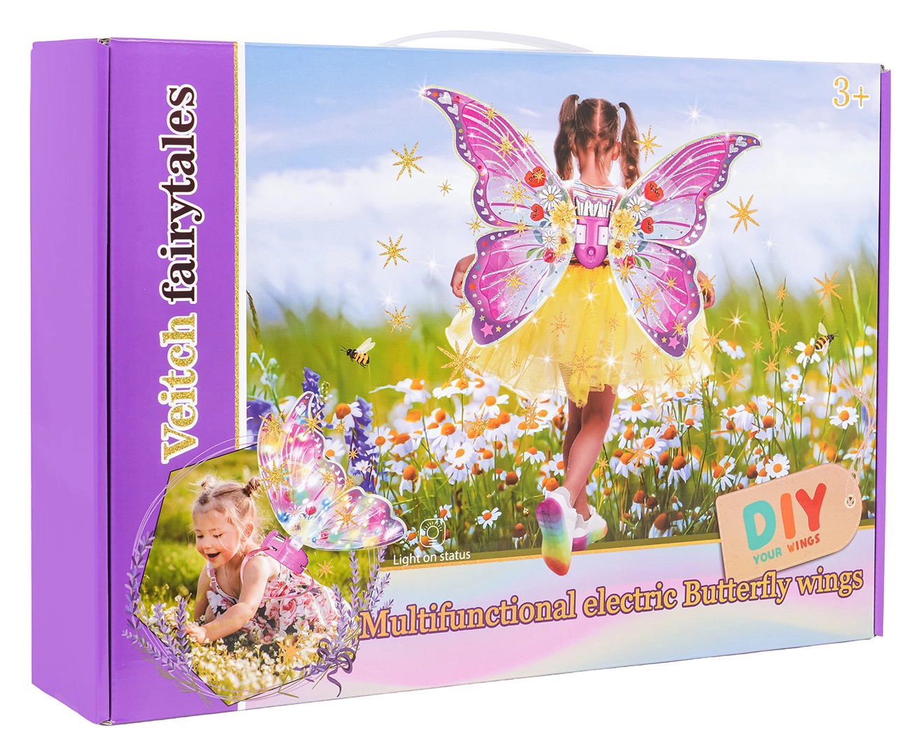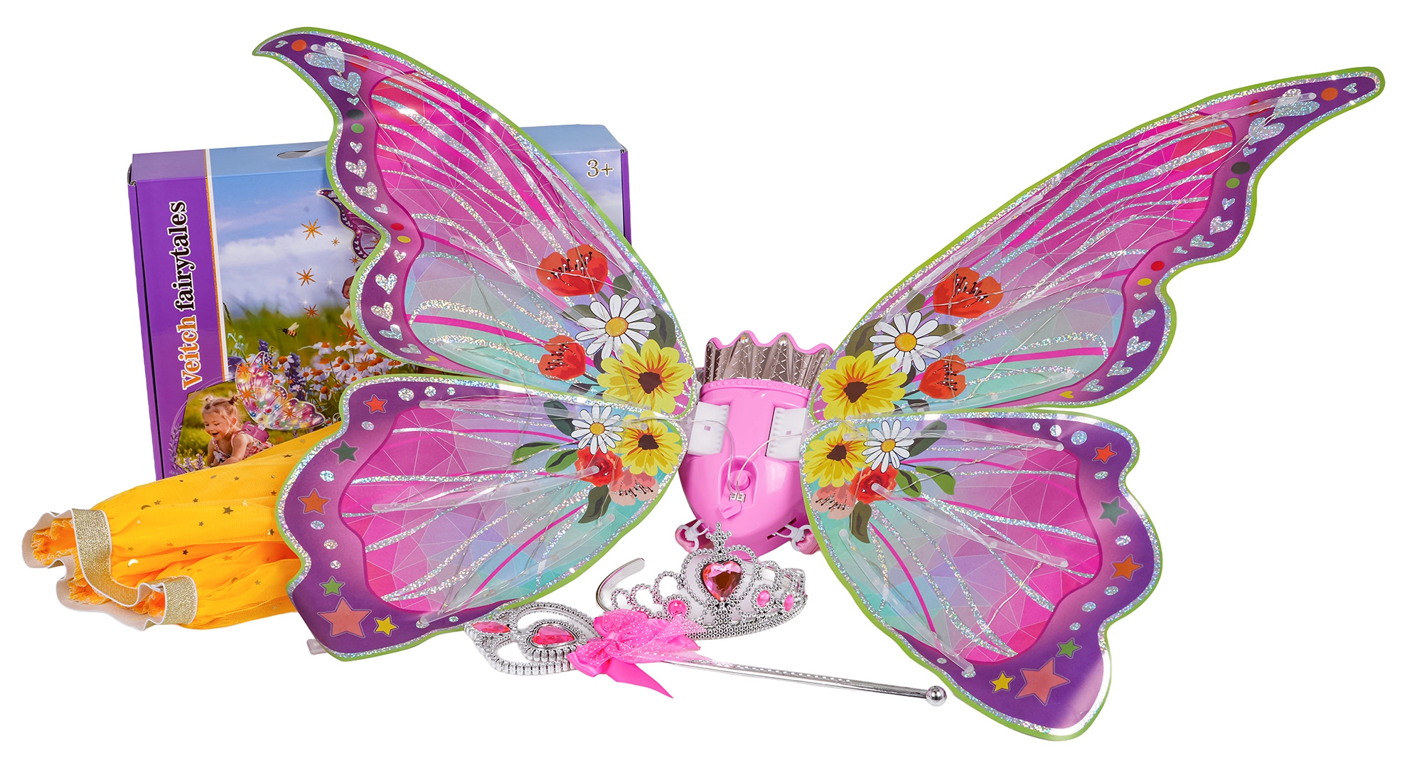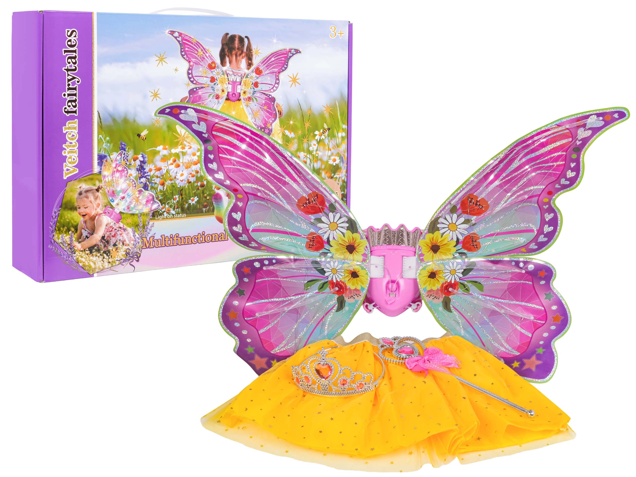 Trasforma ogni giorno in una fiaba con questo set magico per piccole principesse. Include grandi ali di farfalla con luci e musica, un tutù giallo scintillante, una corona argentata e una bacchetta magica. Grazie alle spalline regolabili le ali restano ben salde, gli effetti luminosi e sonori incantano e la gonna leggera con stelle scintillanti garantisce un comfort ottimale. Ideale per carnevali, spettacoli e giochi di fantasia a casa. Le ali offrono più modalità di battito e illuminazione e sono alimentate da 4× AA 1,5 V (non incluse).