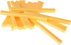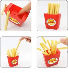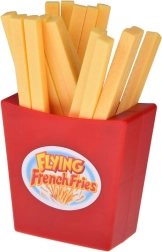 Il bicchiere rosso acceso e le patatine gialle in plastica leggera sono resistenti, sicuri e facili da riporre nella confezione.