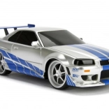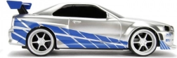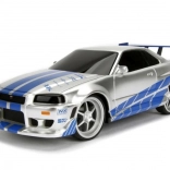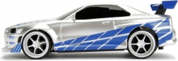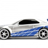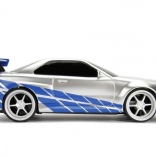 Dettagli in argento‑blu con decalcomanie, alettone e cerchi sportivi che piaceranno ai fan di Fast & Furious e ai collezionisti di modelli.