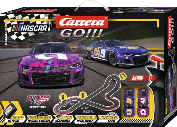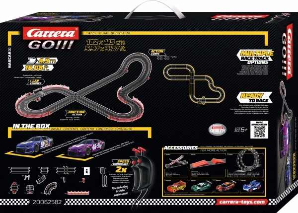 Parti in gara come sull’ovale TALLADEGA! La pista Carrera GO in scala 1:43 offre un layout ricco di azione con parete verticale, incrocio e preciso contagiri meccanico. Le due auto NASCAR licenziate Chevrolet Camaro Next Gen (n. 9 NAPA e n. 48 Ally) grazie ai magneti e alle spazzole doppie restano in traiettoria anche nei tratti veloci.