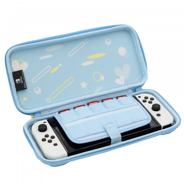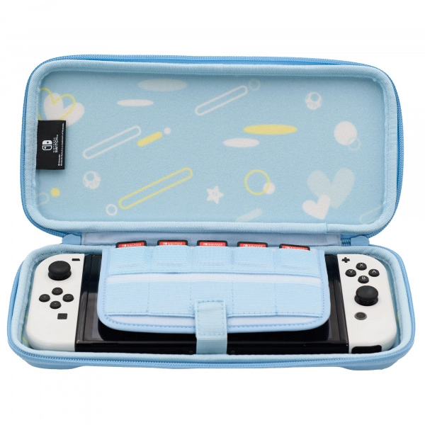 L’interno completamente rivestito protegge la console da graffi e urti, mentre il portacartucce può contenere fino a 10 titoli, per avere sempre la tua libreria a portata di mano. Il design con illustrazioni della principessa Peach all’interno e all’esterno, arricchito da zip con stelline del mondo di Super Mario, dona alla custodia uno stile giocoso.