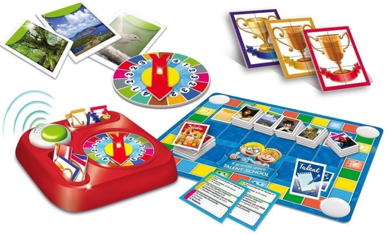 - 312 carte, spinner, timer elettronico, tabellone di gioco, basetta, batterie, istruzioni