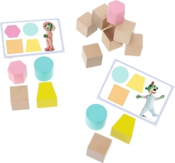 Set educativo in legno per i più piccoli con 15 blocchi colorati e carte con i personaggi BOBAŚKI E ORSETTO di Trefl. I bambini associano le forme corrette alle carte, sviluppando motricità fine, classificazione delle forme e pensiero logico. Realizzazione sicura in legno con vernici atossiche e possibilità di combinare con altri set O! Klocki.