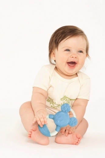 La superficie testurizzata del dentaruolo favorisce la percezione sensoriale e lo sviluppo della motricità fine. La forma ergonomica con presa sicura invoglia il bambino a tenerlo da solo ed esplorarlo in sicurezza.