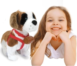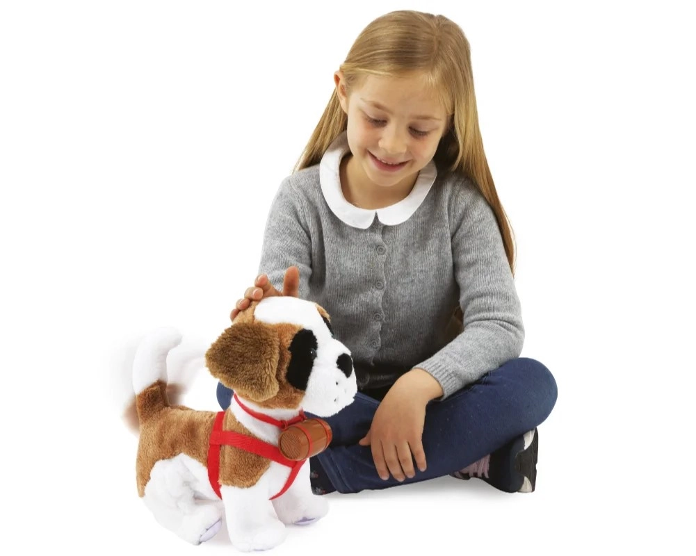 Il manto soffice, la pettorina rossa e il collare con il tipico barilotto donano al gioco un tocco realistico da cane da soccorso e stimolano la fantasia.