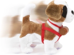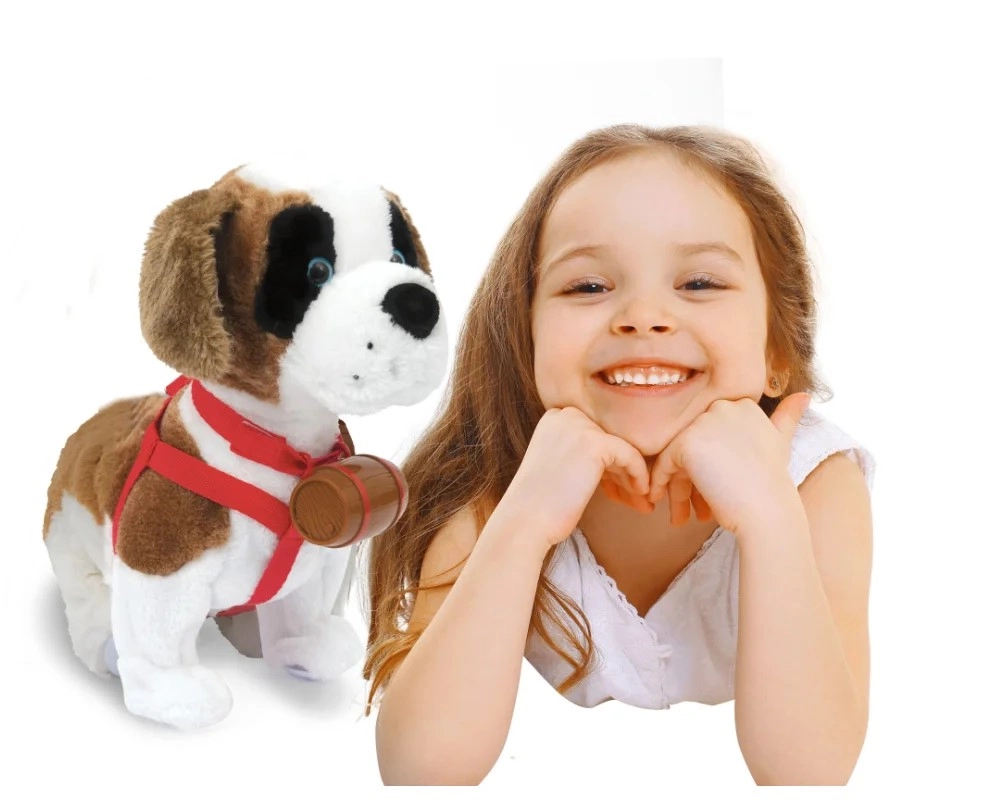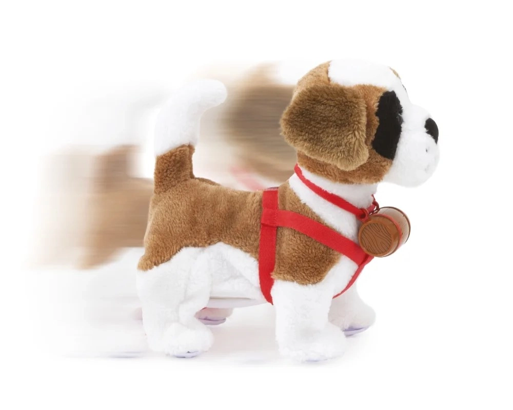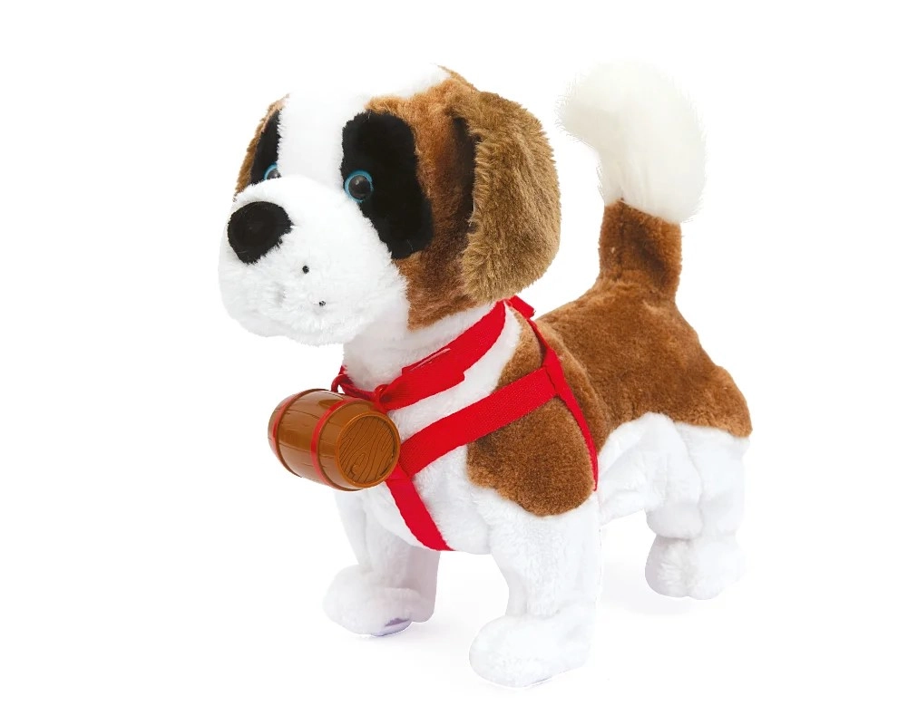 Samby è un morbido San Bernardo di peluche che riproduce fedelmente il comportamento di un vero cane. Se lo accarezzi sulla testa, abbaia e scodinzola felice; con la pettorina indossata e una carezza sui fianchi reagisce con entusiasmo. Con un battito di mani lo inviti a camminare, il tutto senza controlli complicati.