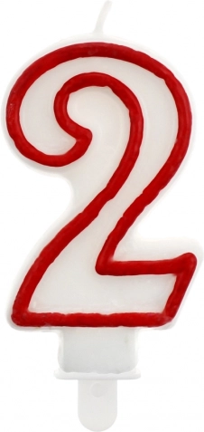 Elegante candela di compleanno a forma di numero 2 con corpo bianco e marcato bordo rosso, che dona alla torta un aspetto elegante e festoso. Grazie al pratico supporto si posiziona facilmente e in modo stabile sulla torta. Ideale per compleanni, anniversari e altre celebrazioni.