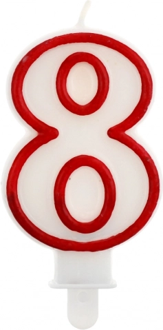 Elegante candela di compleanno a forma di numero 8 con contorno rosso che dona alle torte un look raffinato e attira l’attenzione. Grazie al pratico supporto si posiziona facilmente e in modo stabile sulla torta. Accessorio universale per feste dei bambini e anniversari.