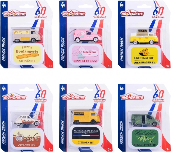 La serie comprende sei veicoli di stile ispirati alle delizie francesi: CITROËN HY (French Boulangerie – marrone, Moutarde de Dijon – giallo), RENAULT Kangoo (Macaron – rosa), RENAULT Trafic (Huile d’olive – verde), VOLKSWAGEN T1 (Fromagerie – giallo) e CITROËN 2CV (Café – beige). Ogni modello è in scala 1:64, lungo ca. 7,5 cm ed è riposto in un’elegante scatola in metallo da collezione.