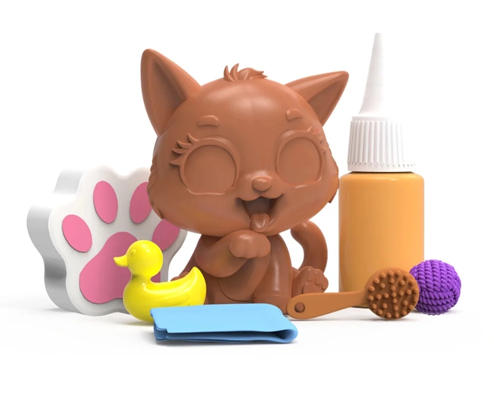 - 1 figurina di gattino, 1 tubetto con fango, 5 accessori (spugnetta, spazzolino, paperella, gomitolo, asciughino)