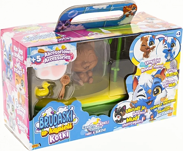 - 1 figurina del gattino Puszek, 1 vaschetta con doccino, 1 tubetto di fango, 5 accessori (asciugamanino, paperella, spazzolino, spugnetta, sale da bagno)