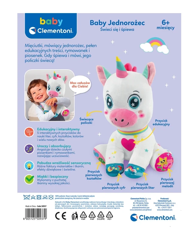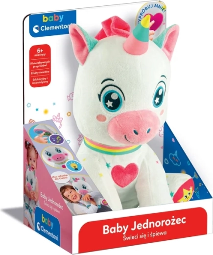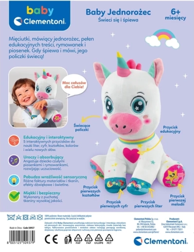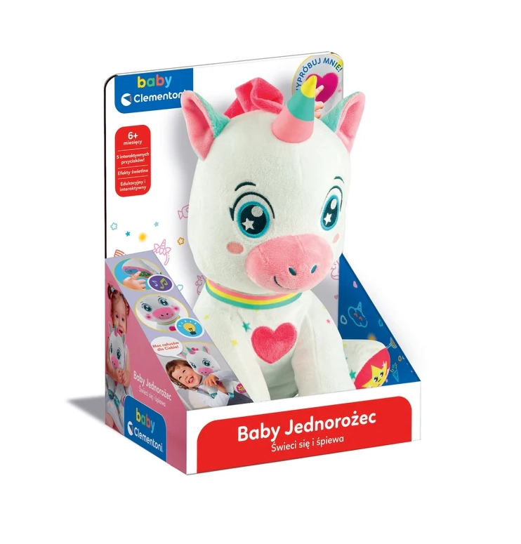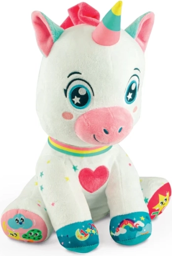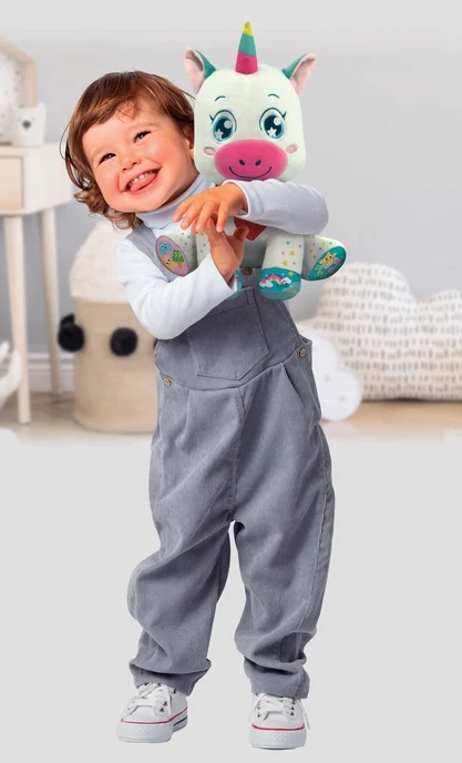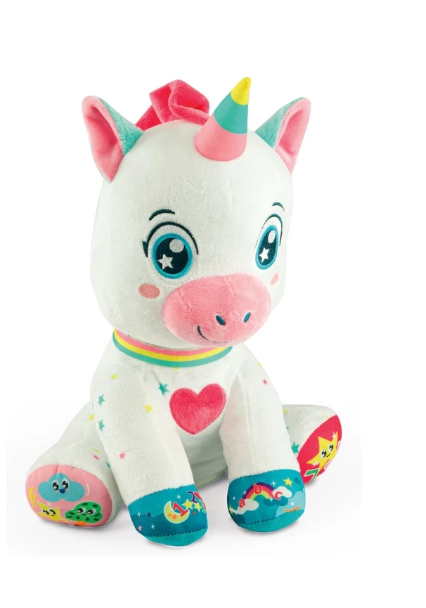 Il dolce unicorno interattivo di BABY CLEMENTONI farà felici i bambini dai 6 mesi. Ha 5 pulsanti touch sulle zampette e sul cuoricino che attivano suoni, canzoncine e filastrocche e insegnano lettere, numeri, forme e colori. I materiali morbidi e atossici, i viso illuminato e il corno luminoso supportano la percezione visiva, la motricità fine e l’arricchimento del vocabolario.