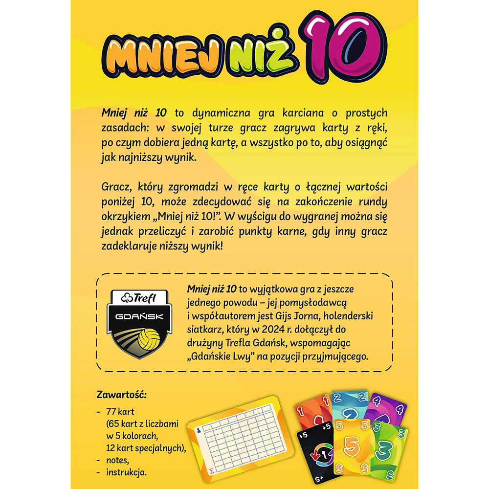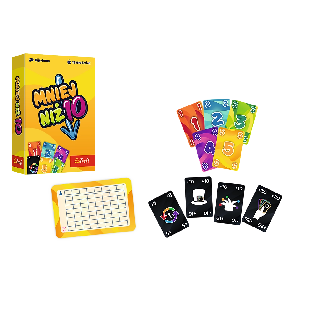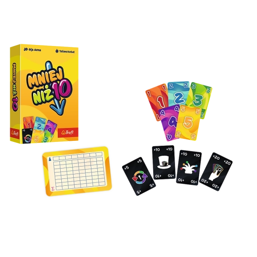 Un gioco di carte veloce e avvincente in cui cerchi di avere in mano il totale di punti più basso possibile – idealmente meno di dieci. I giocatori si alternano, giocano carte o combinazioni e pescano nuove carte per ridurre il proprio totale. Non appena qualcuno raggiunge meno di 10 punti, può chiudere il round gridando “Mniej niż 10!”. Vince chi ha davvero il totale più basso, mentre gli altri ricevono punti penalità. Ideale per 2–8 giocatori, da 8 anni, con una durata di circa 20 minuti – perfetto a casa e in viaggio.