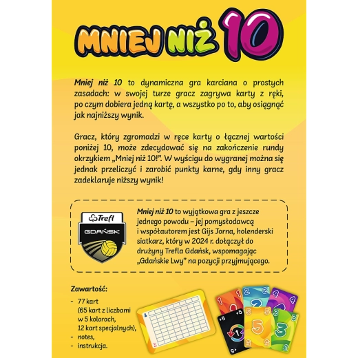 Cerchi un gioco di carte rapido e accessibile che diverta famiglia e amici? Mniej niż 10 combina regole semplici con giocabilità tattica. A ogni turno scegli se giocare una o più carte e come modificare astutamente il totale dei punti per avvicinarti alla soglia vincente sotto dieci.