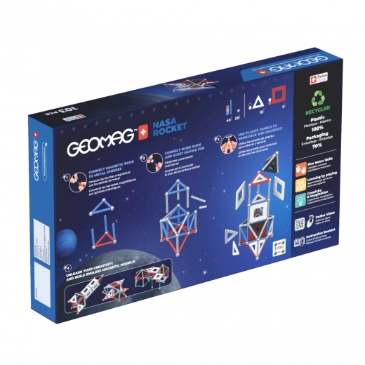 Questa edizione limitata delle costruzioni magnetiche GEOMAG, realizzata in collaborazione con la NASA, entusiasmerà piccoli e grandi appassionati di spazio. Grazie ai magneti potenti, ai telai leggeri e ai collegamenti metallici, potrai costruire facilmente un razzo, un modulo lunare e strutture di fantasia. I pezzi resistenti e gli agganci intelligenti assicurano stabilità dei modelli e gioco fluido.