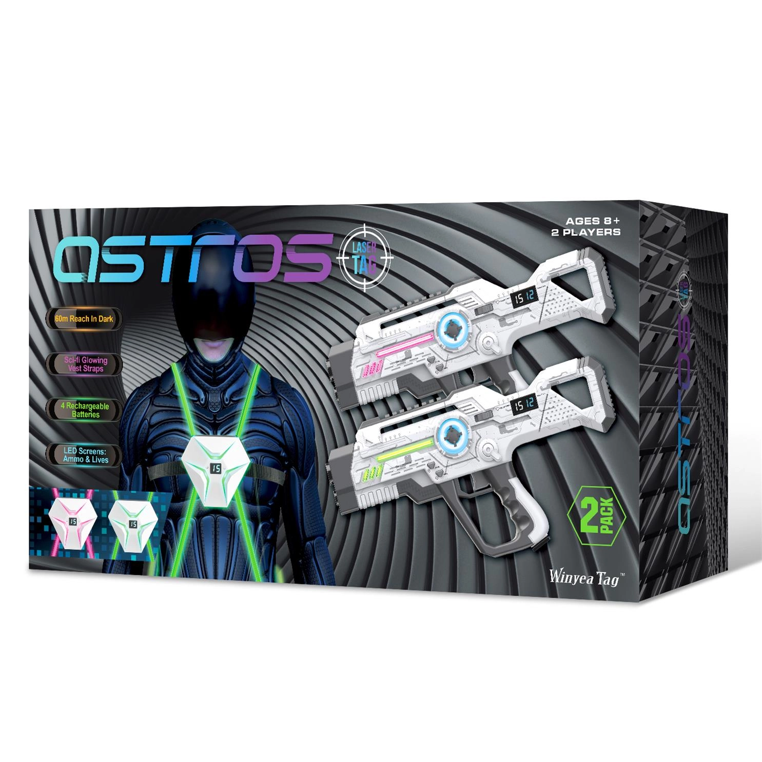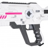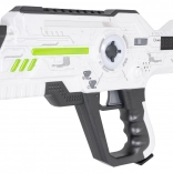 Scegli il colore della squadra (arancione, blu, rosso, verde) e passa tra le modalità: tiratore singolo, fucile laser, mitra e fucile al plasma. Le cinghie illuminate migliorano la visibilità al crepuscolo e i comandi vocali mantengono il ritmo della partita. La portata di tiro è fino a 60 m al buio. Incluso cavo di ricarica USB con quattro connettori per ricaricare comodamente tutti i dispositivi contemporaneamente.