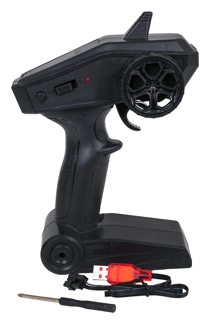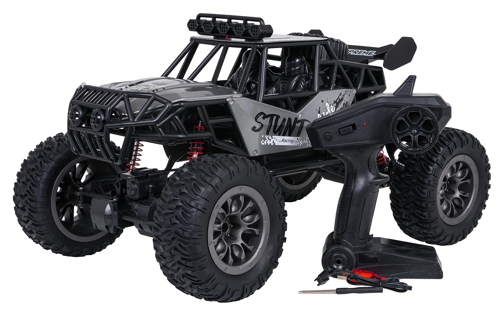 Grazie alla trazione integrale 4x4, all’alta altezza da terra e alle sospensioni a molla indipendenti, il modello scala facilmente gli ostacoli e gestisce acrobazie. I fari anteriori e il pannello LED sul tetto migliorano la visibilità e donano un look accattivante. La pratica alimentazione con batteria da 7,4 V (inclusa) fa risparmiare pile; il radiocomando richiede 4× AA (non incluse).