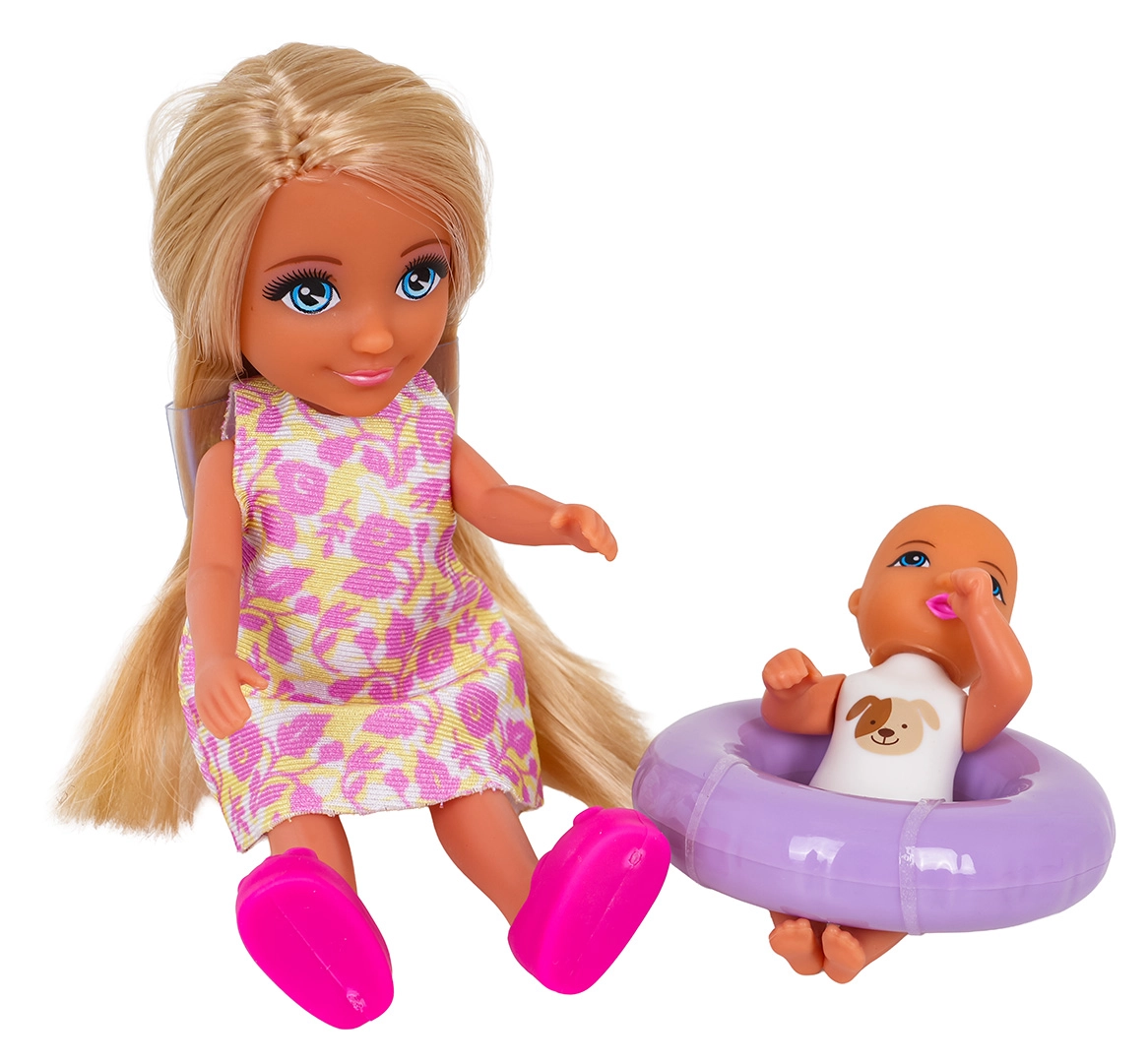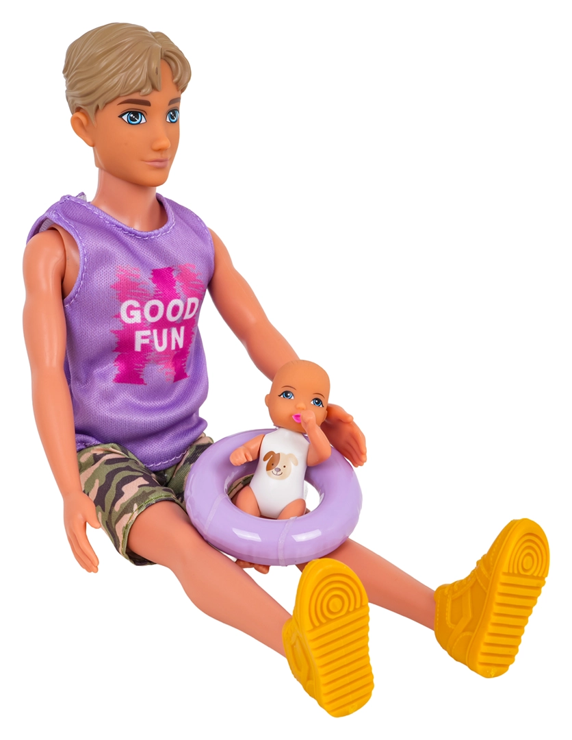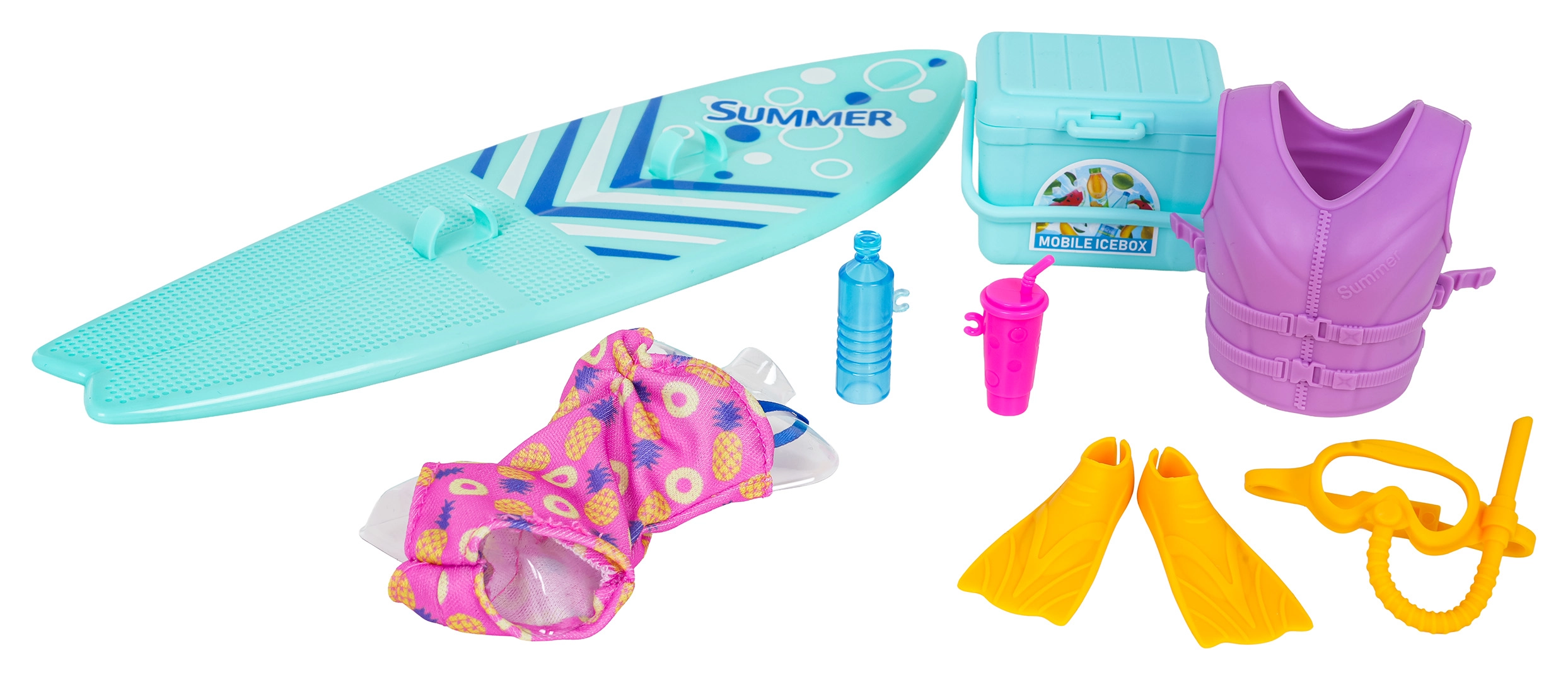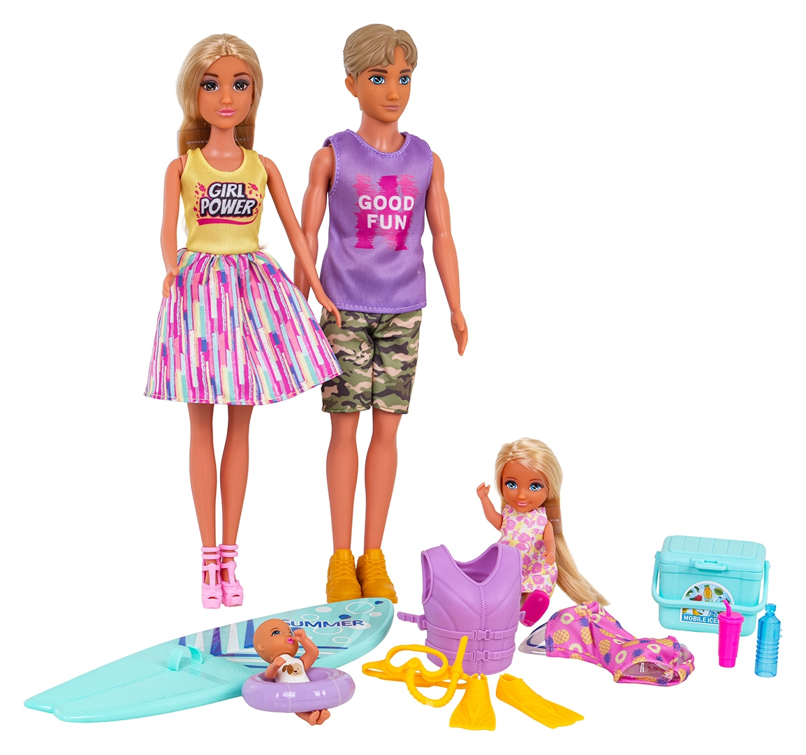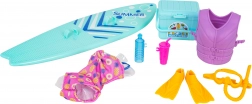 - 4 bambole (mamma, papà, figlia, bebè), tavola da surf, giubbotto di salvataggio, pinne, maschera/set ossigeno, costumi da bagno, borsa frigo, 2 bottigliette/bicchierini per bevande, salvagente