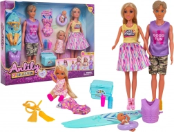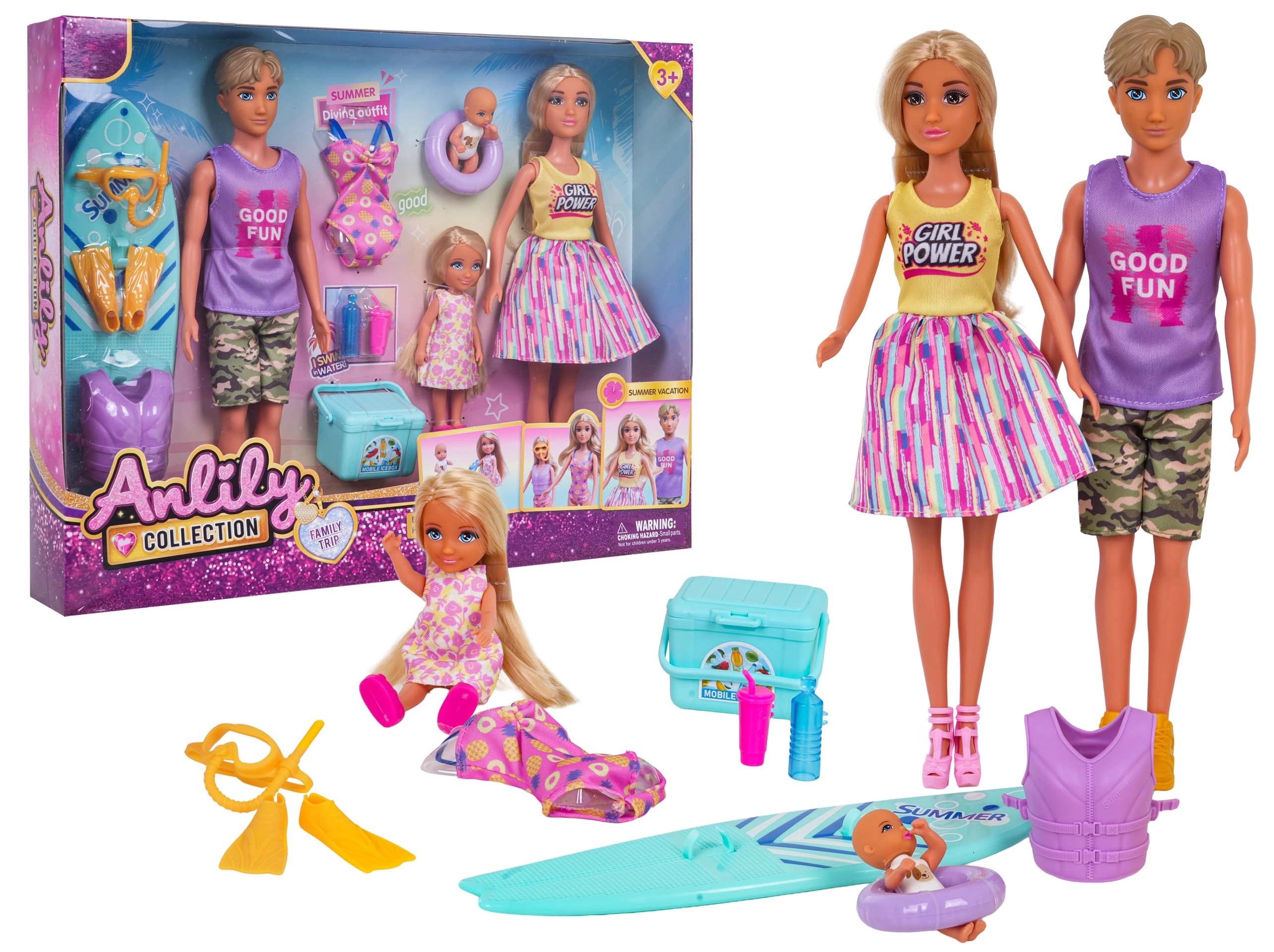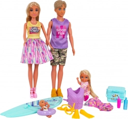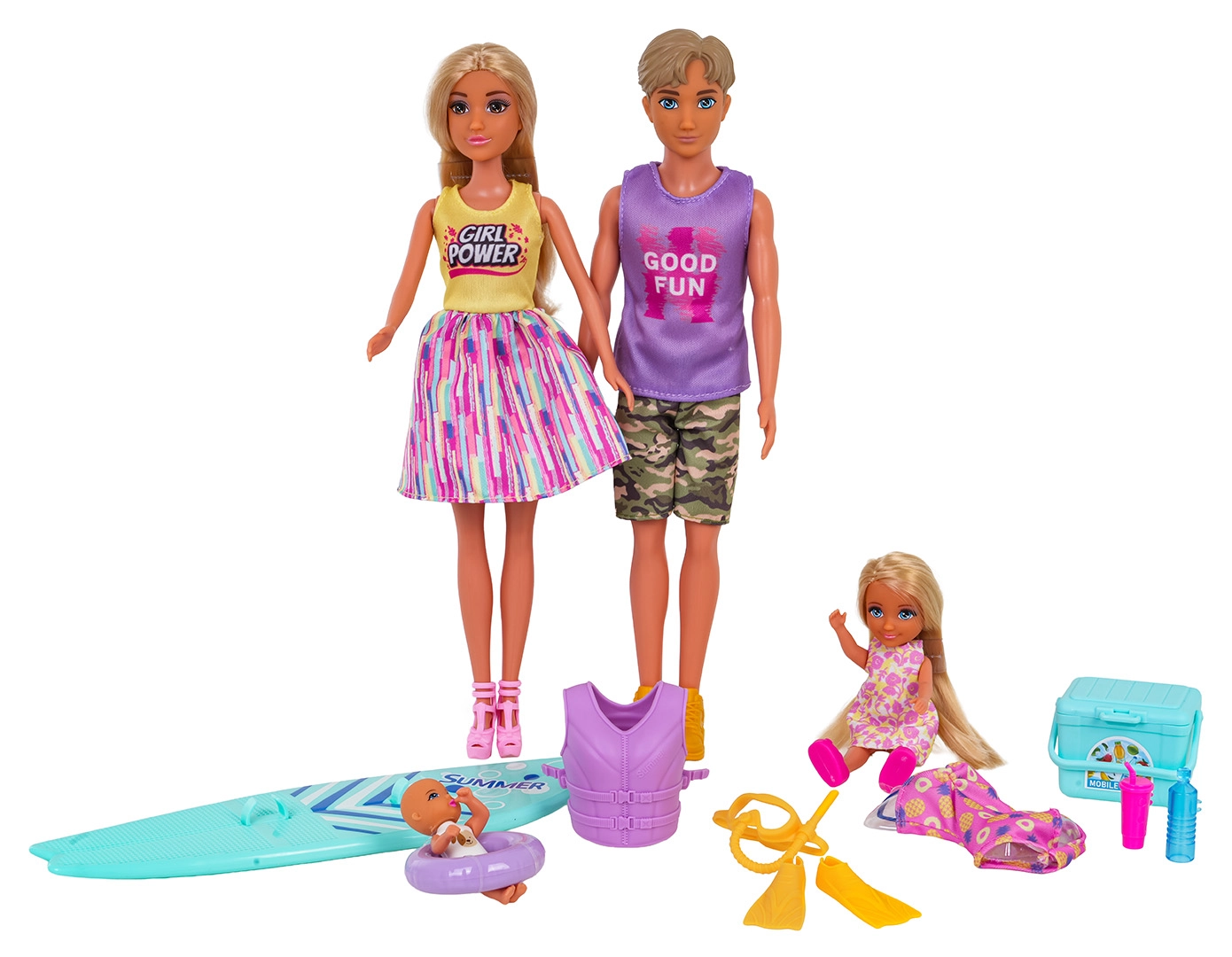 Vivi avventure estive con questo set da spiaggia per la famiglia: mamma, papà, figlia e bebè, con tanti accessori per fare surf e nuotare. Inclusi, tra gli altri, tavola da surf, giubbotto di salvataggio, pinne, salvagente e borsa frigo per bevande. Le bambole hanno arti snodabili e si cambiano facilmente, rendendo il set ideale per gioco di ruolo creativo, sviluppo dell'immaginazione e ore di divertimento.