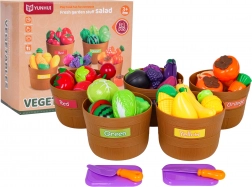 Due coltelli, due taglieri e cestini resistenti compongono un set completo che sostiene il gioco creativo, la motricità e la conoscenza degli alimenti.