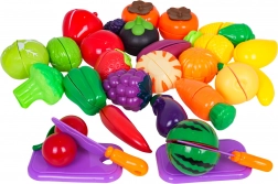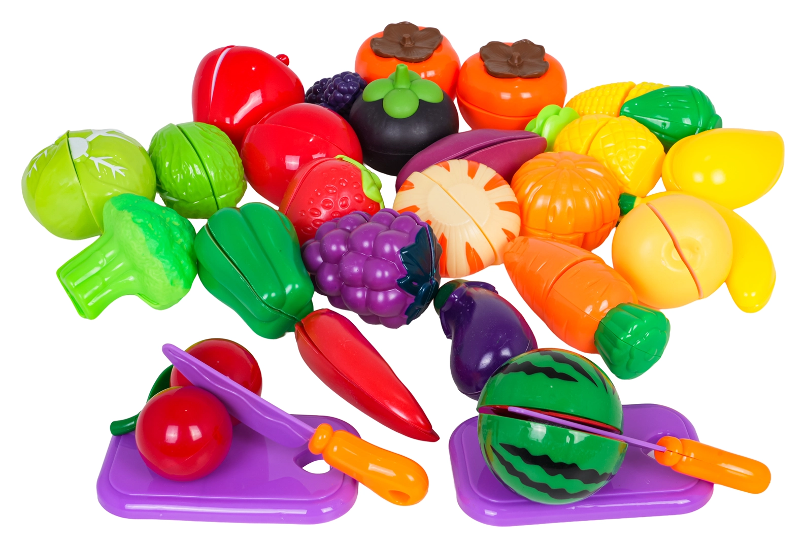 Molti frutti sono uniti da chiusura a strappo: i bambini possono “tagliarli” ripetutamente con i coltelli di plastica inclusi sui taglieri, senza rischio di ferirsi.