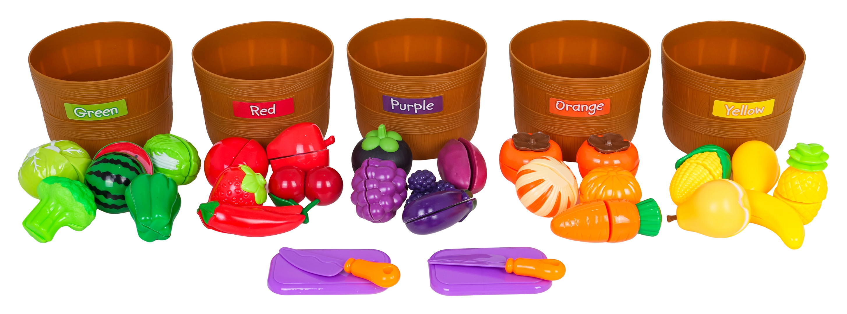 Cinque cestini contrassegnati (verde, rosso, viola, arancione, giallo) aiutano i bambini a classificare facilmente frutta e verdura per colore e sviluppano il pensiero logico.
