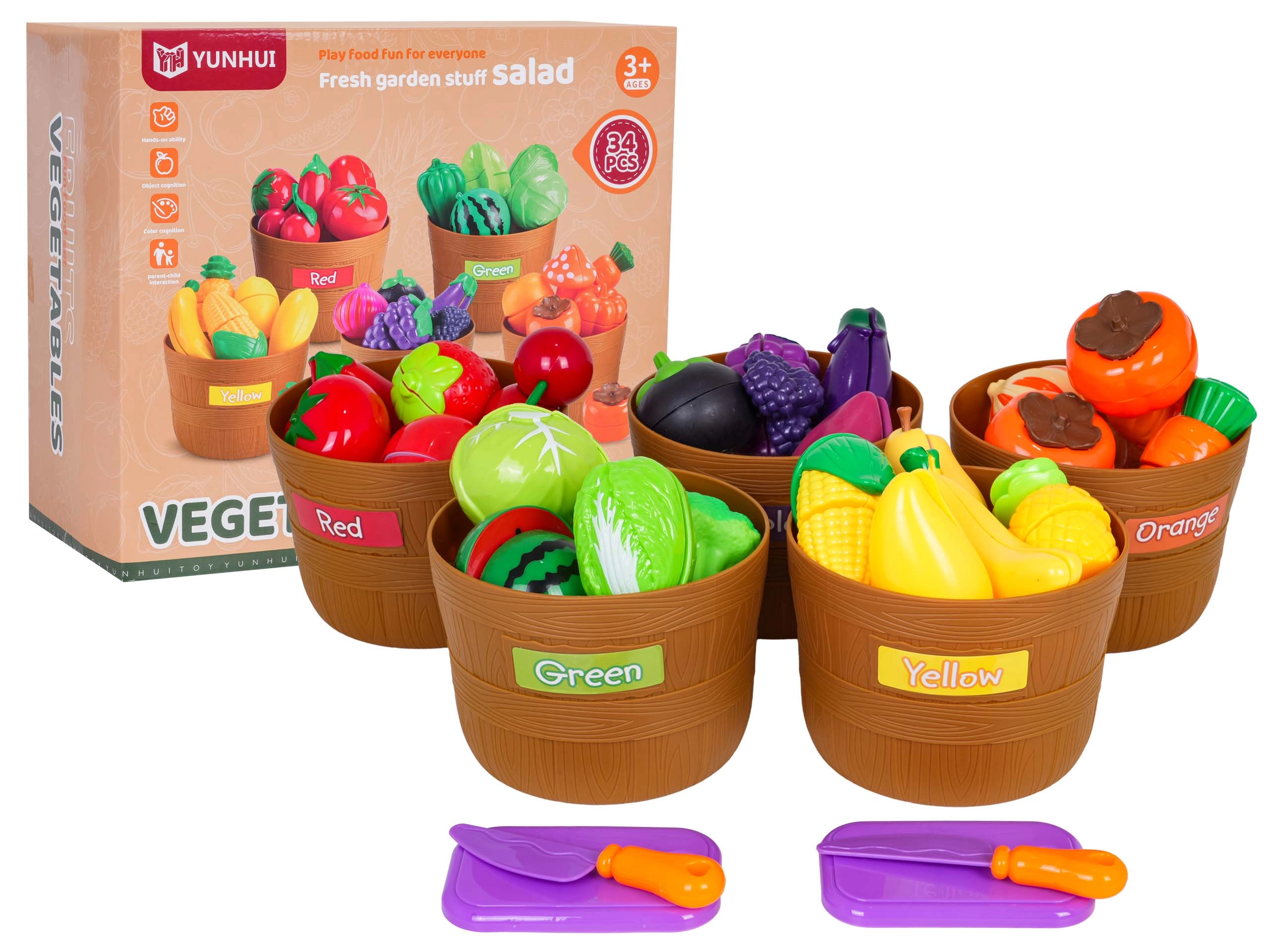 Questo set colorato è ideale per piccoli chef. I bambini possono dividere frutta e verdura nei cestini contrassegnati per colore (giallo, viola, arancione, verde, rosso) e, grazie alla chiusura a strappo, “tagliarli” in sicurezza sui taglieri inclusi. La struttura robusta in plastica di qualità resiste al gioco quotidiano.